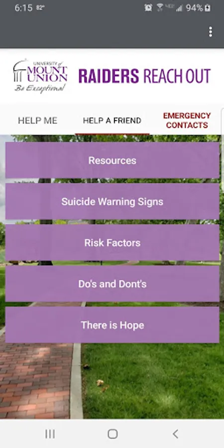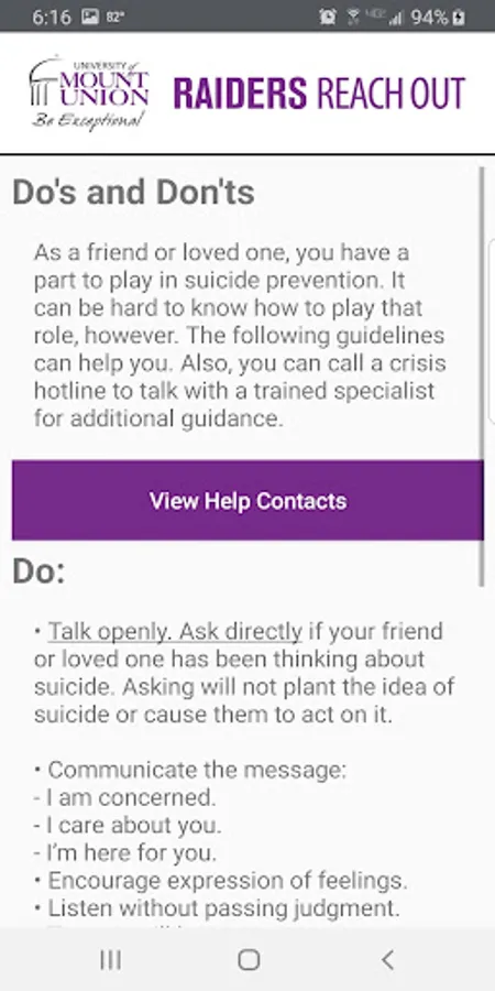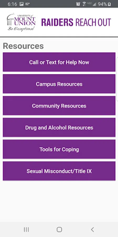 University of Mount Union's Raiders Reach Out app provides quick access to guidance for supporting a friend in need, suicide prevention, or coping with mental health challenges. It also supplies information about resources, referrals, and counseling services offered on the campus and in the community, including crisis hotline numbers. The Raiders Reach Out app is designed for students, parents, friends of students, faculty, and staff of the University of Mount Union (UMU), located in Alliance, Stark County, Ohio. The Reach Out app better prepares people to help a friend, loved one or themselves.