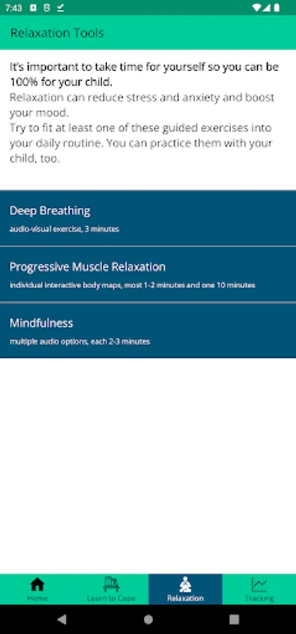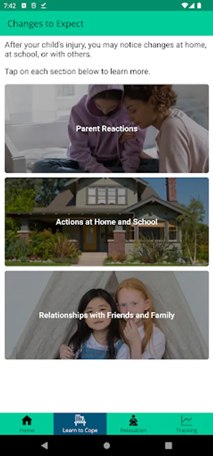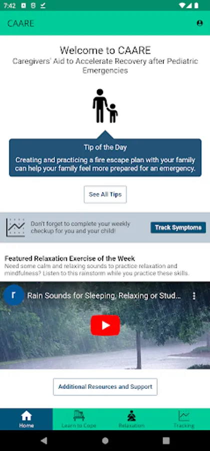Users will have access to videos, audio recordings with relaxation strategies, activities, and other tools to promote emotional and behavioral health recovery after pediatric injury. Tools can be used by parents alone or may be used with children to practice skills together to improve mood and stress. Users also have access to additional resources within the app such as websites and tools to locate a mental health therapist in their area. Approximately 30 days after download, the app will notify users to complete a brief mental health screen for parents and their children to assess follow-up emotional and behavioral health recovery.