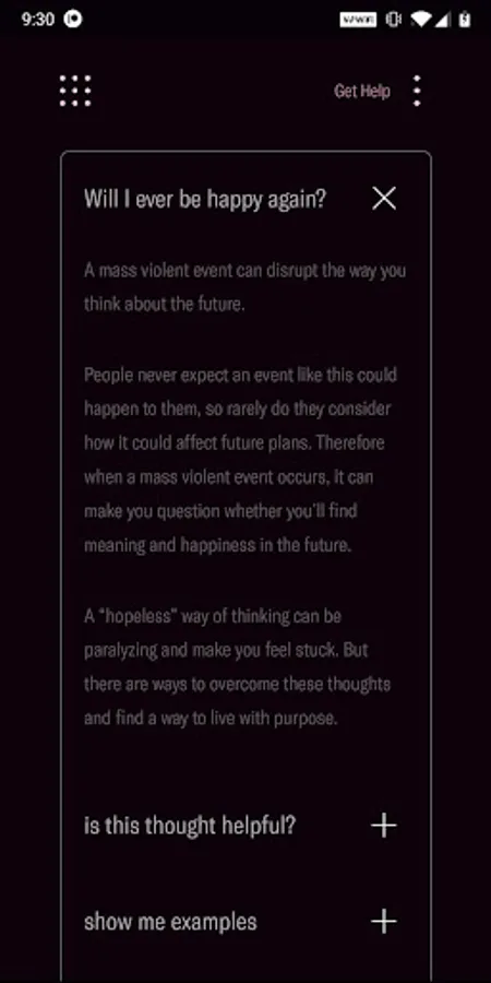 If you need additional assistance, please consult a healthcare professional or contact one of the agencies provided in the “Get Help” section of this app.