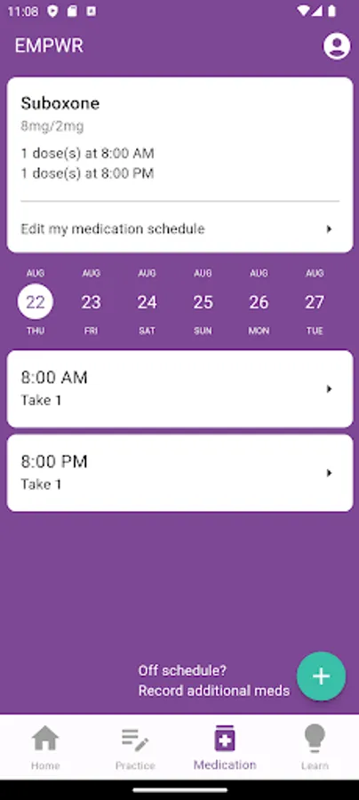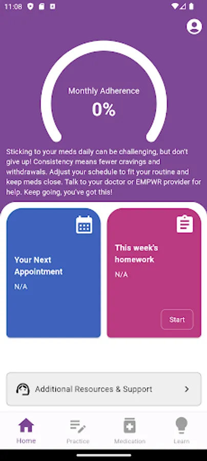The EMPWR app includes a medication tracking and reminder system to help users take their prescribed buprenorphine and provides feedback on their medication adherence. The app also includes education on using buprenorphine during pregnancy, perinatal health, and infant and parenting information, as well as coping skills, methods to improve sleep in pregnancy and after childbirth, and recovery and treatment resources.