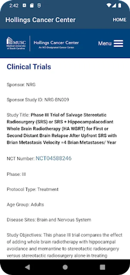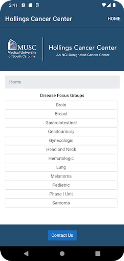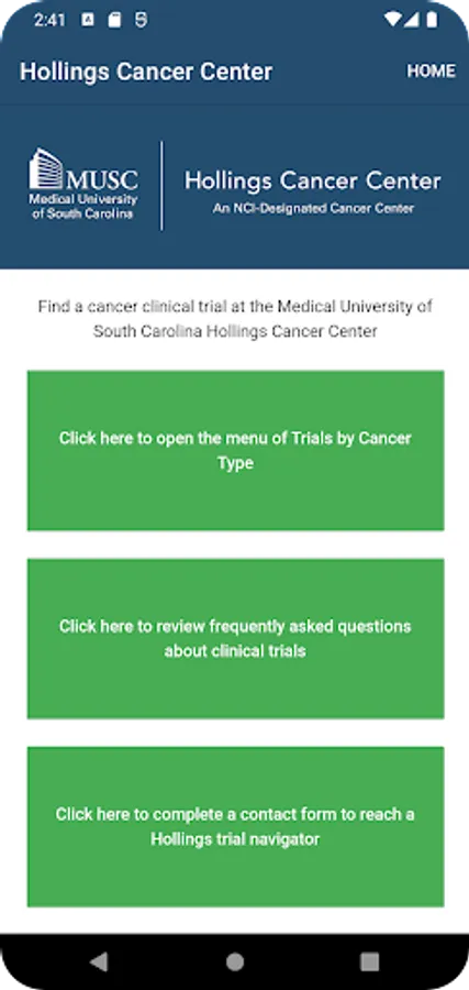 This application is designed for health professionals seeking clinical trial opportunities for cancer treatments opened at the Medical University of South Carolina (MUSC) Hollings Cancer Center (HCC) or at any cancer center within the MUSC NCI Community Oncology Research Program for Minority and Underserved (NCORP-MU). Clinical trials are research studies looking at novel therapies that are considered investigational.
