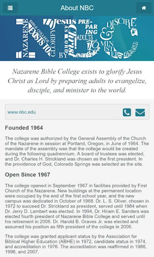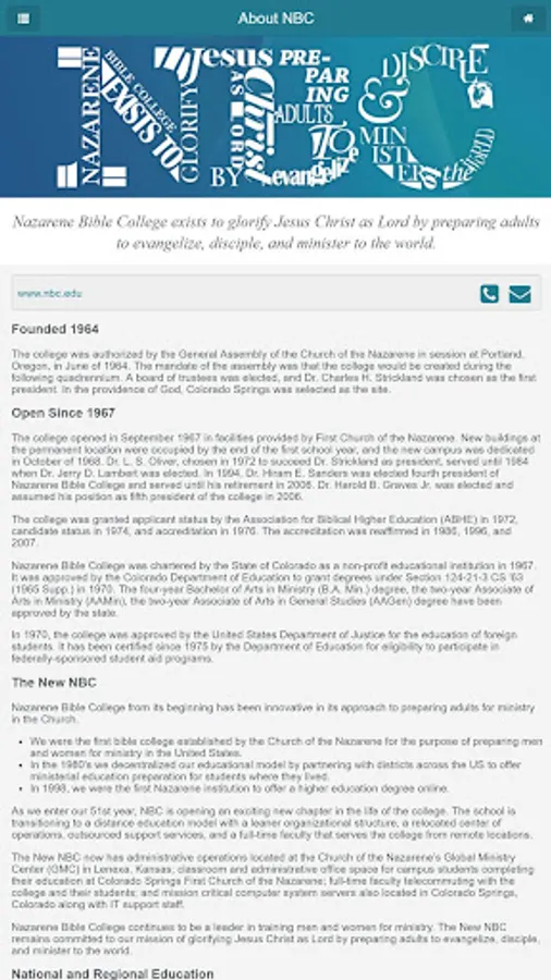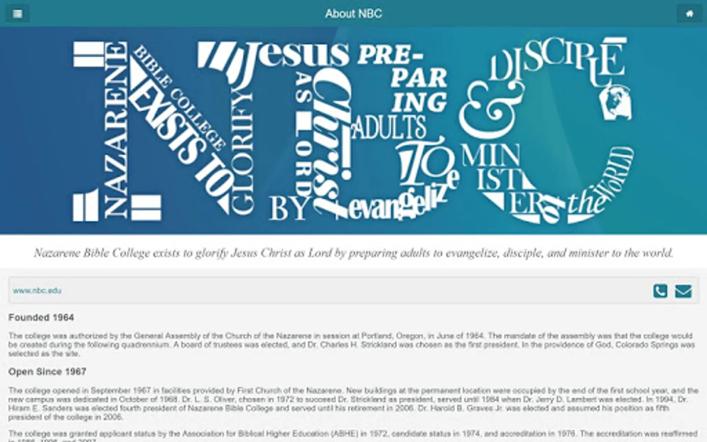 Students, alumni, and friends, keep up to date with what is happening at Nazarene Bible College, while on the go. Read news and blogs or check up on old friends with our alumni directory. The NBC Mobile app will keep you connected to the institution you love.