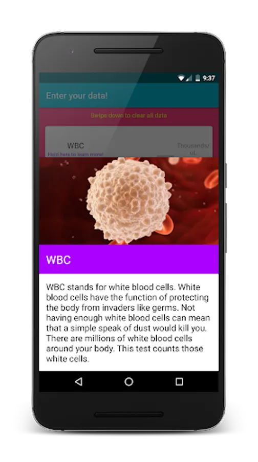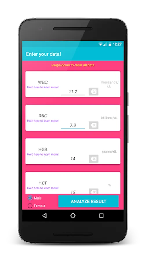 I will not hold the creators of this application responsible if any harm befalls on me as a result of misinformation from this application. Lastly, I am aware that the reference ranges used in this application come from a textbook titled Hematology: Clinical Principles and Applications written by Rodak, Firtsma, and Keohane. I am aware that these reference ranges may not apply to me, and that I should seek out the proper reference ranges for myself.
