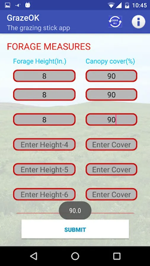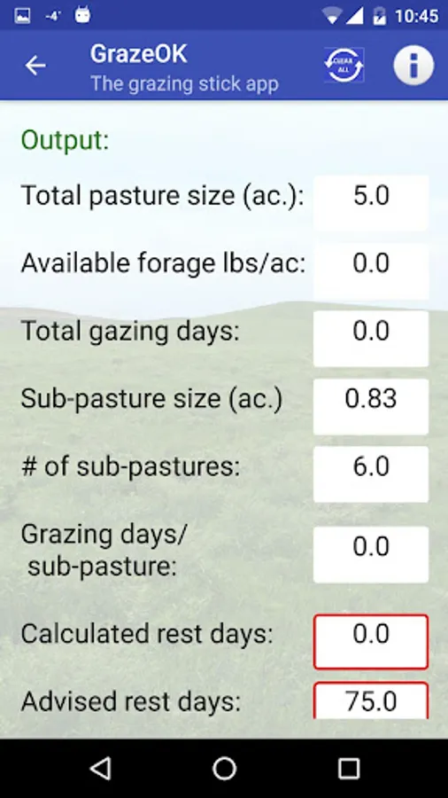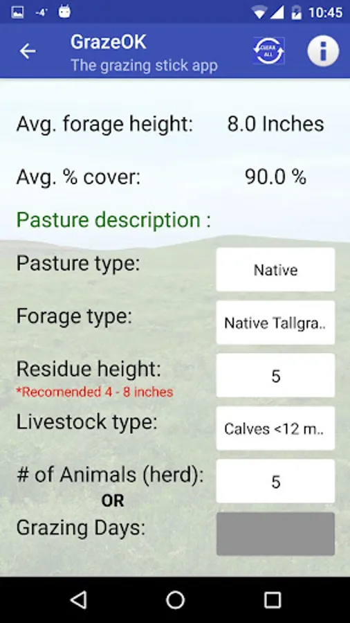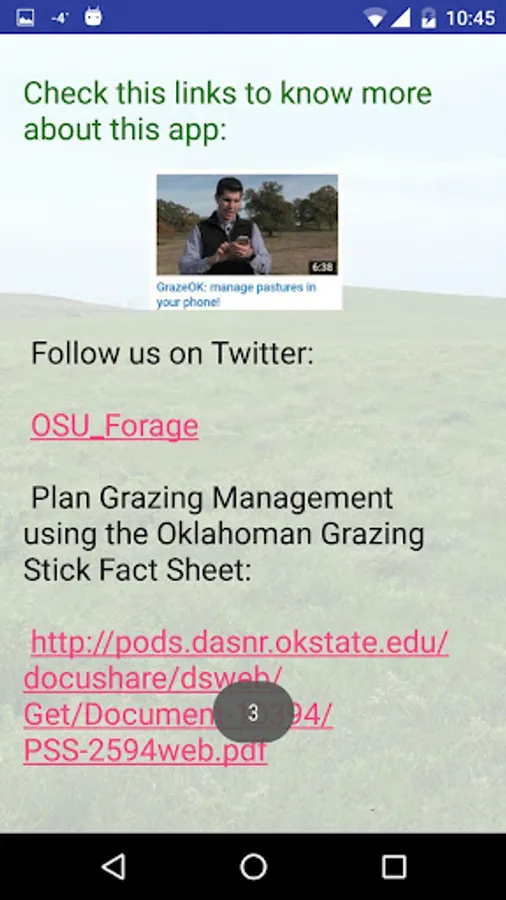 Managing livestock demands accurate and fast decisions for a successful operation. Nowadays, managers rely on either inaccurate visual inferences or expensive tools for acquiring fast answers to in-farm issues. GrazeOK is a user friendly electronic version of the Oklahoman grazing stick which allows fast and proper estimation of stock density, number of pastures, grazing and rest days by simply measuring plant height and canopy cover with a yard stick and inputting them in your phone. An accompanying YouTube video explaining the app and how to collect data is available at https://www.youtube.com/watch?v=-uYNVwx9Rb4.