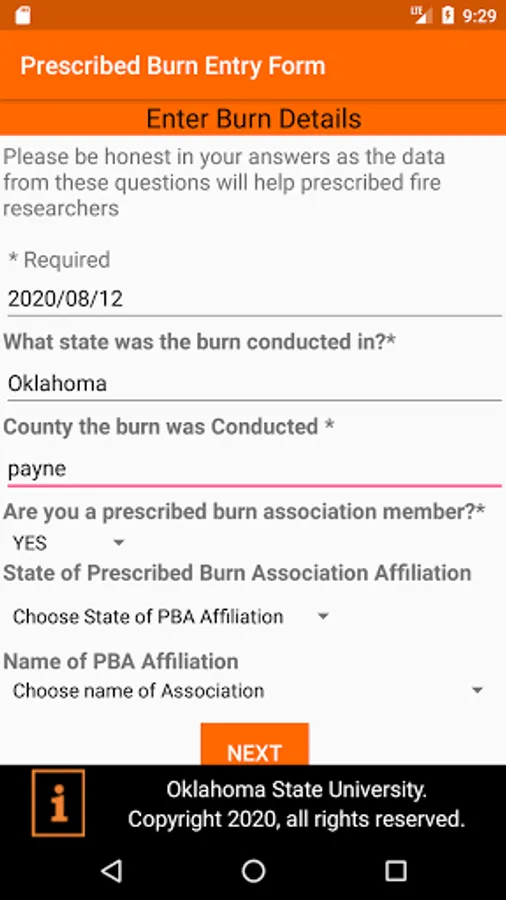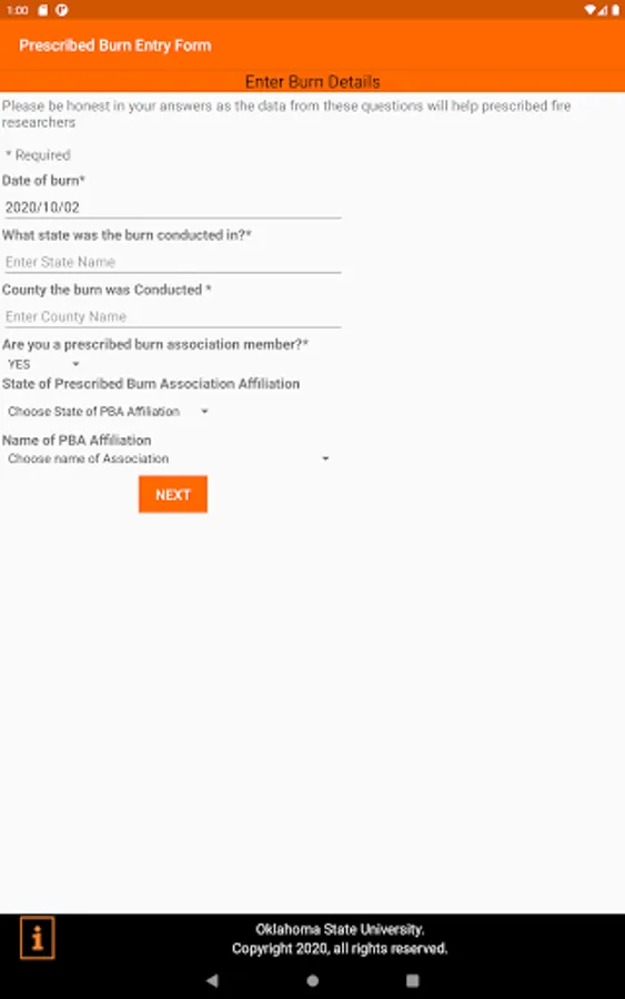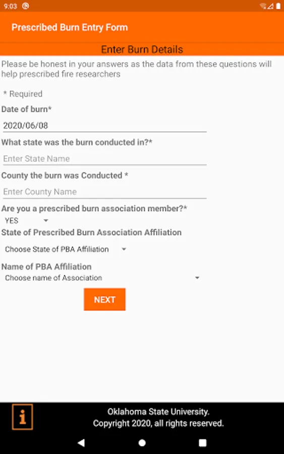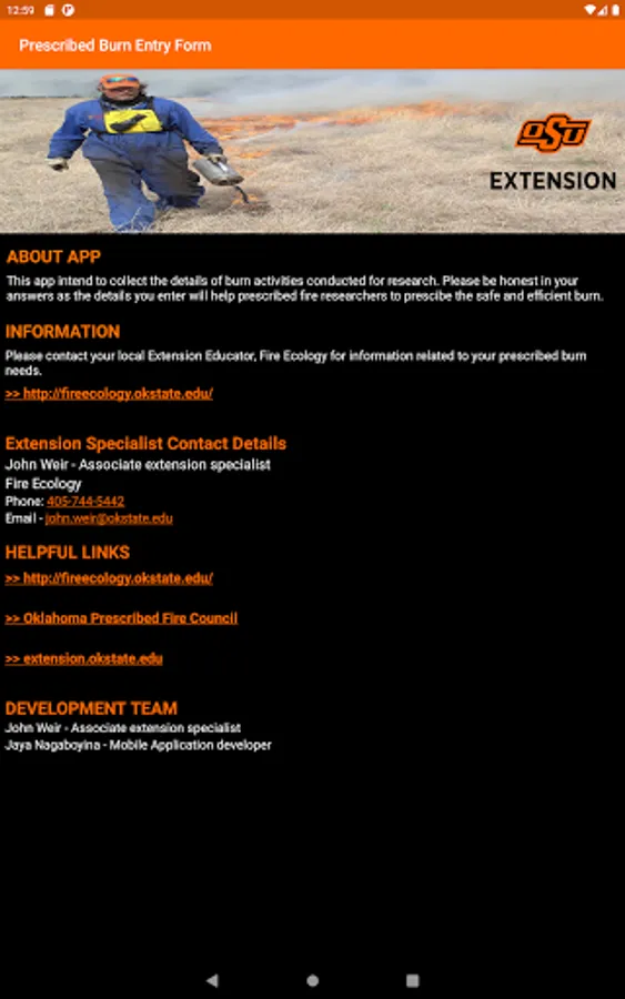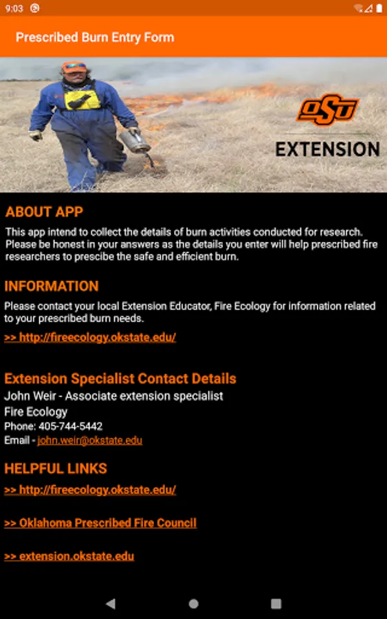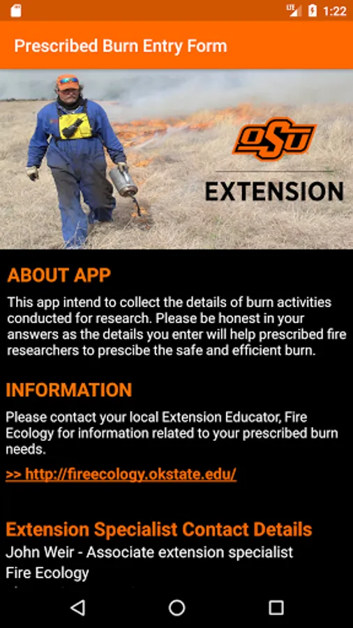 This app intends to collect the details of burn activities conducted for research. Please be honest in your answers as the details you enter will help prescribed fire researchers to prescribe the safe and efficient burn.