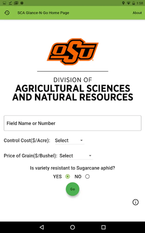 This application will help determine if a grain sorghum field needs to be treated with insecticide from an infestation of sugarcane aphid. Users will choose a treatment threshold based on control cost, treatment cost, and sorghum variety resistance. The sampling consists of checking two leaves, on three separate sorghum plants per stop, until a decision is made.