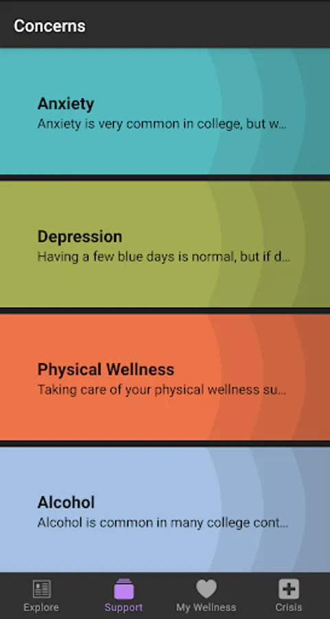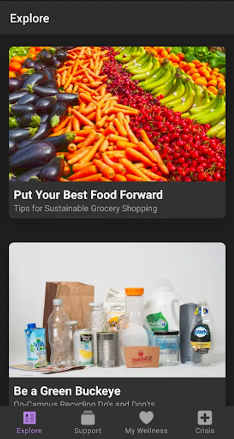 • The Crisis tab provides clear directions for accessing support. This feature is also currently available as I'm Experiencing an Emergency or Crisis in the Ohio State app About You tab.