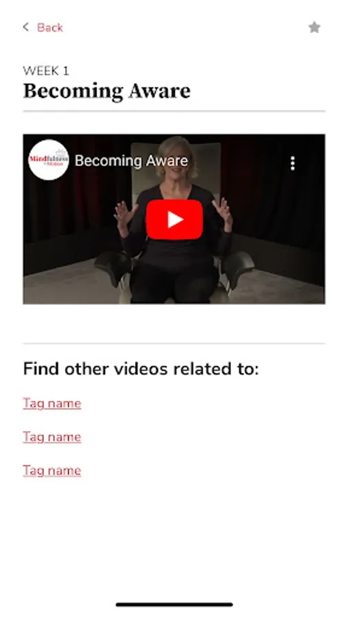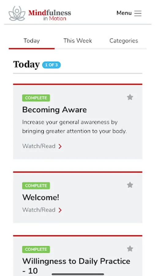 The Mindfulness in Motion app will enhance your experience with mindfulness by providing on-the-go practices and reminders to truly be in the present moment. Start the program by establishing a baseline through a pre-program survey. Allow yourself to supplement your weekly session by choosing from over 20 practices and readings each week that focus on the theme of the week. Then, apply all that you have learned by answering a weekly reflection question that relates to the topic of the week. At the conclusion of the program, answer a post-program survey that reflects on your personal progress and the program as a whole.