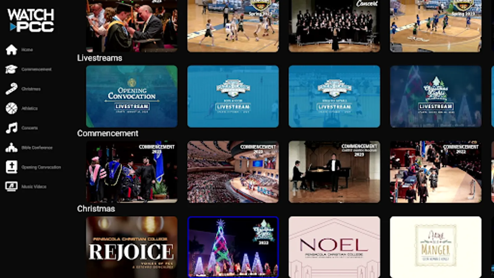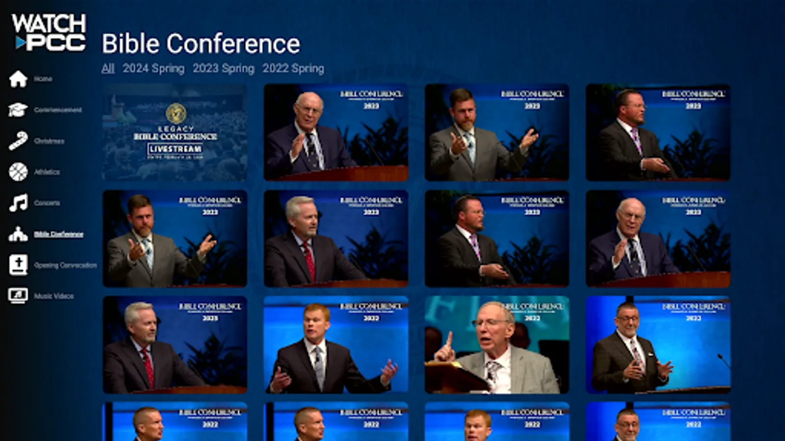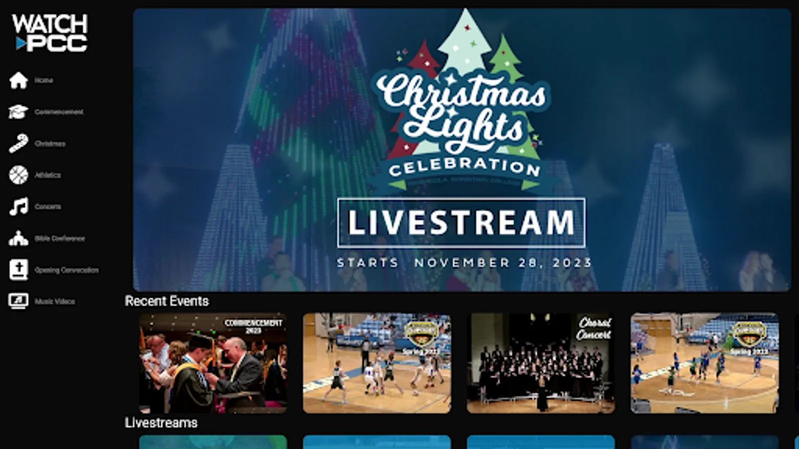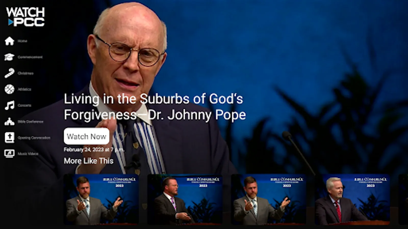 Watch PCC provides a place to view all of our video content, including livestreamed events and music videos produced on the campus of Pensacola Christian College. Find our recent events from Opening Convocation, Bible Conference, Christmas Lights Celebration, Commencement, and more!