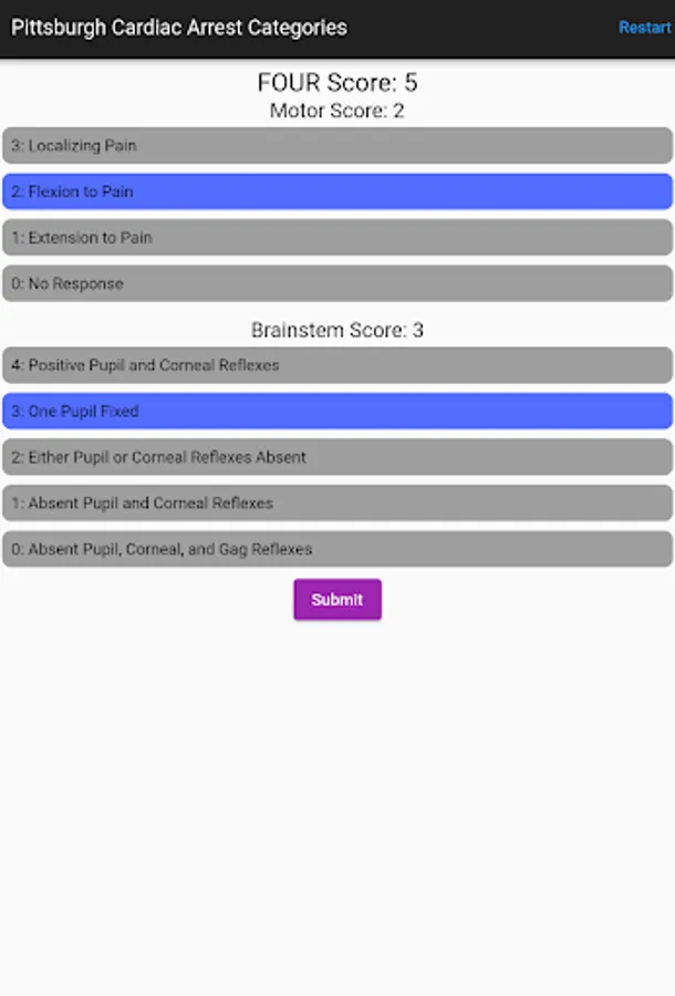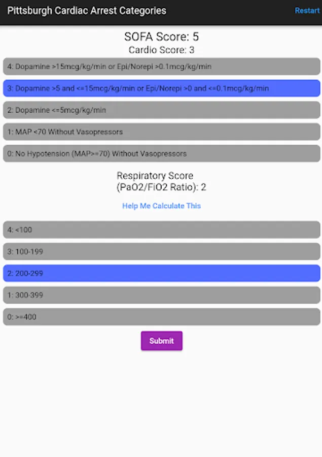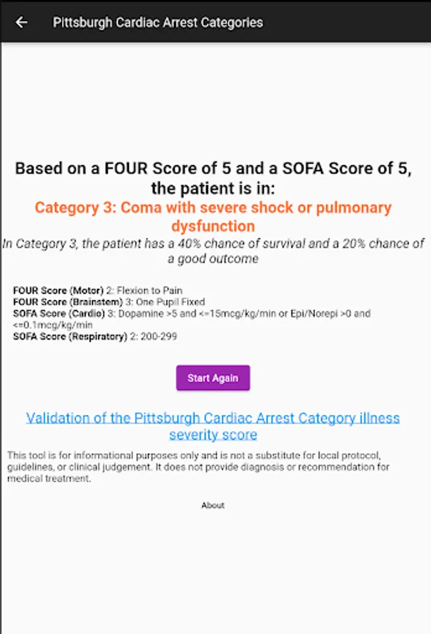 Tool to calculate the Pittsburgh Cardiac Arrest Categories Illness Severity Score, which helps categorize post-cardiac arrest patients in terms of illness severity. This tool provides the questions necessary to calculate the score.