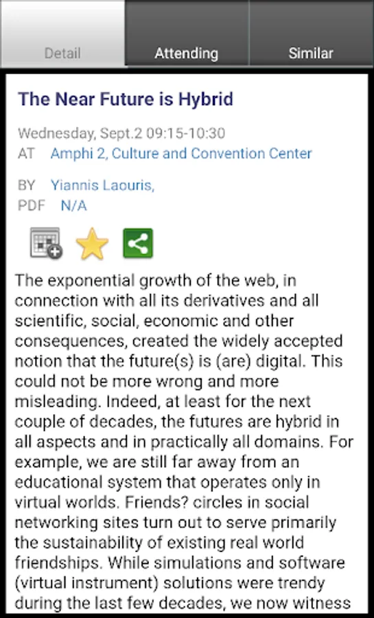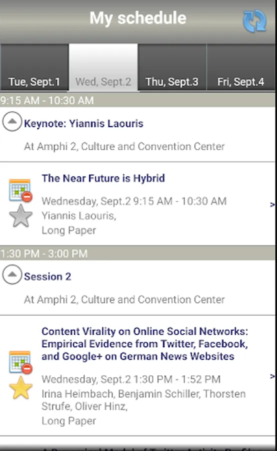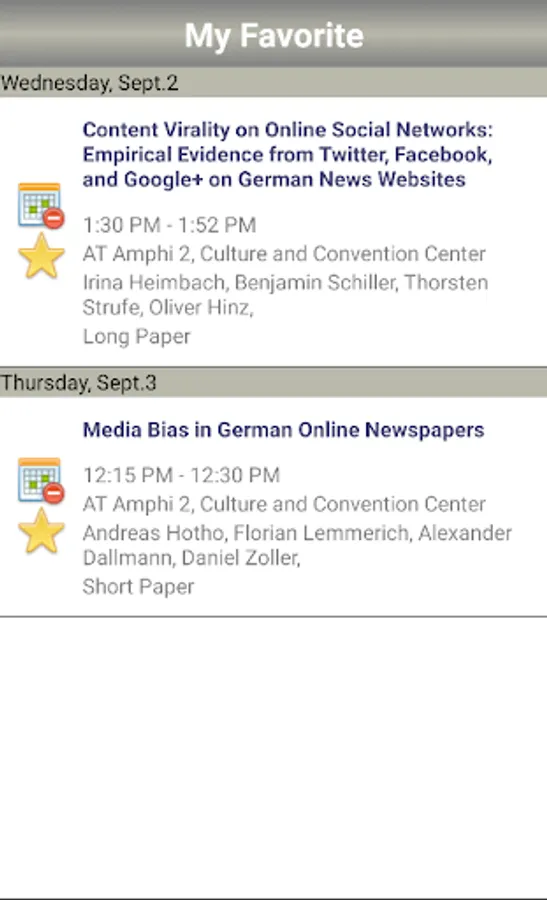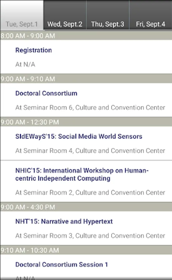 A mobile version of Conference Navigator for Hypertext 2015 Conference (http://ht.acm.org/ht2015/). The app allows to view conference schedule, authors, presented papers, workshops, tutorials, keynotes, and posters. You can mark and schedule papers you liked and interested to attend and receive recommendations. The schedule is being synchronized with the Web version of Conference Navigator @ http://halley.exp.sis.pitt.edu/cn3/conferenceHomePage.php?conferenceID=136