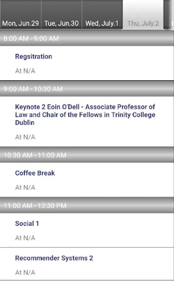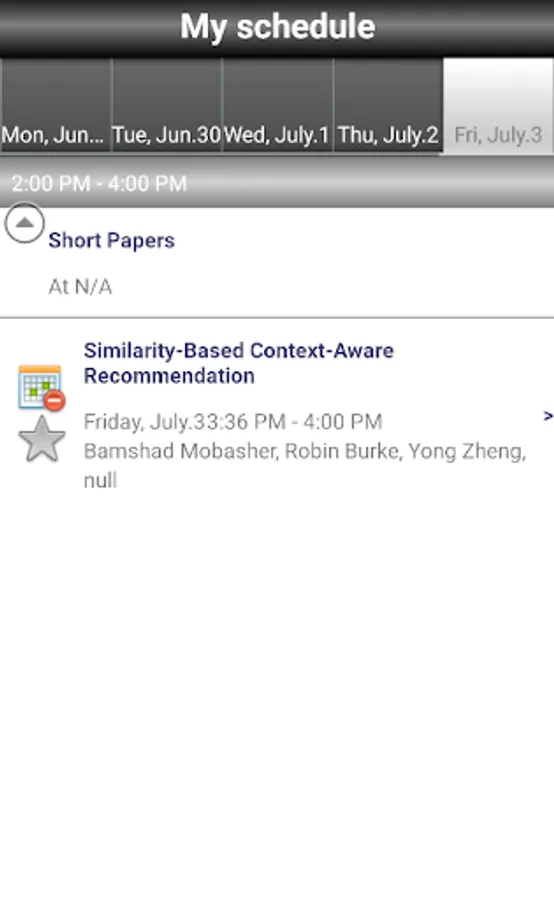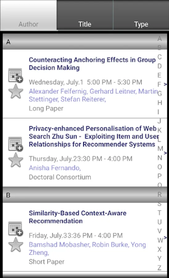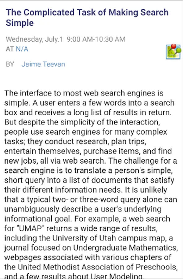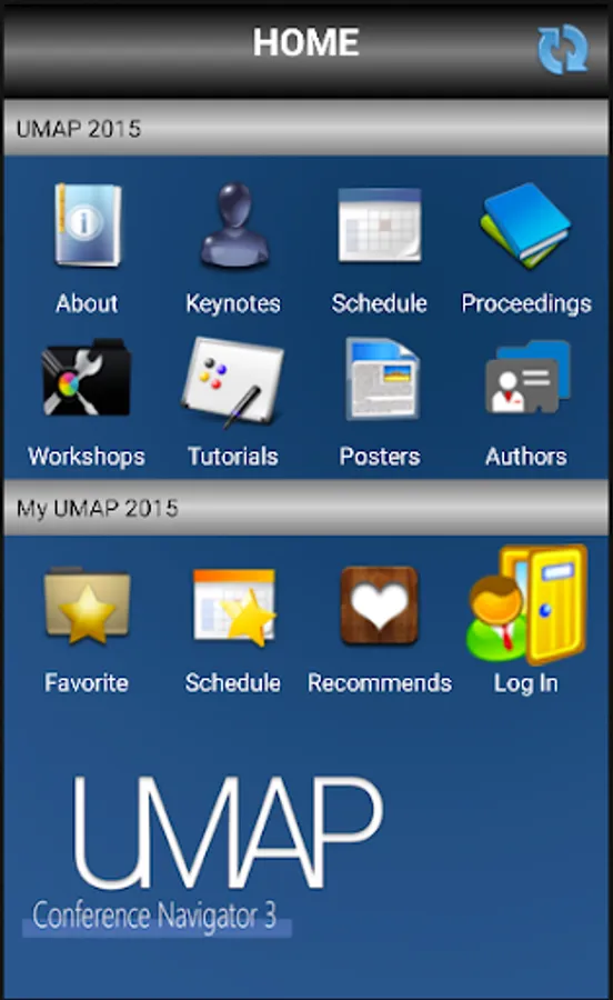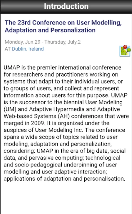 The mobile version of Conference Navigator for UMAP 2015, 23nd International Conference on User Modeling, Adaptation and Personalization (http://umap2015.com/). The app allows to view conference schedule, presented papers, workshops, tutorials, keynotes, and posters. You can mark and schedule papers you liked and interested to attend. The schedule is being synchronized with the Web version of the UMAP 2015 Conference Navigator (http://halley.exp.sis.pitt.edu/cn3/conferenceHomePage.php?conferenceID=134).
