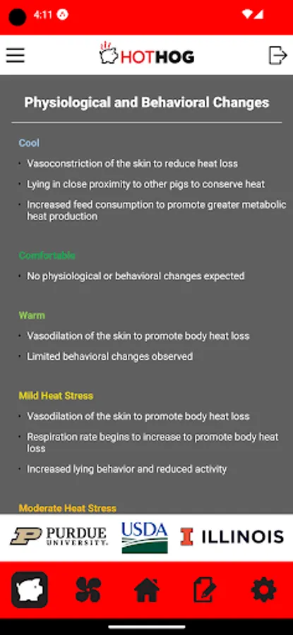 • Physiological and behavioral changes associated with each thermal index category are provided by selecting the pig icon.