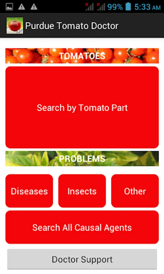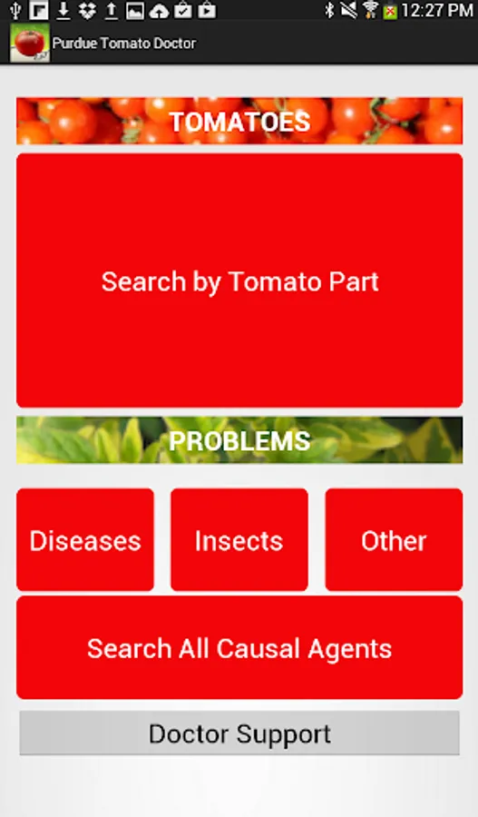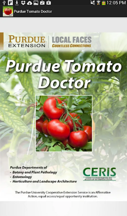 The Purdue Tomato Doctor has been developed by experts at Purdue University to help gardeners identify, diagnose and manage insect, disease, and environmental problems on their tomatoes. The app contains almost 500 high quality images to help users throughout North America diagnose their most common (and uncommon) tomato problems.