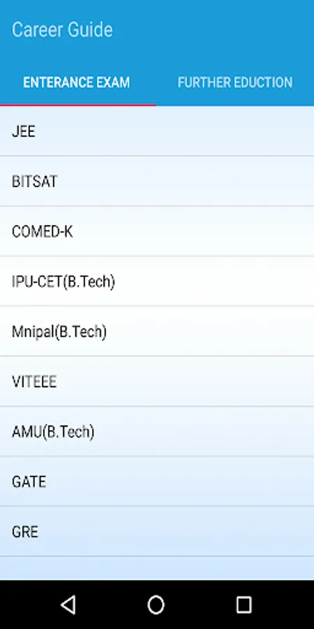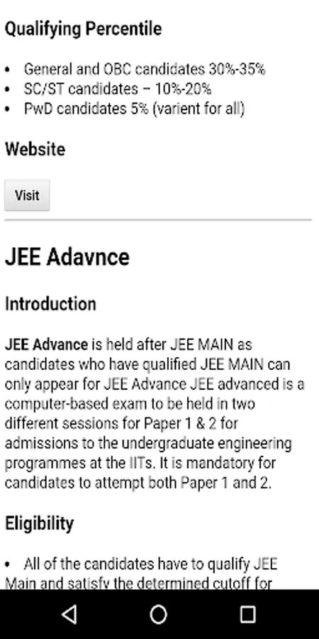 -This Application Contains Entrance Exam Introduction , Eligibility , Exam Criteria ,Reservation of Seats , Qualifying Criteria and official website for that exam.