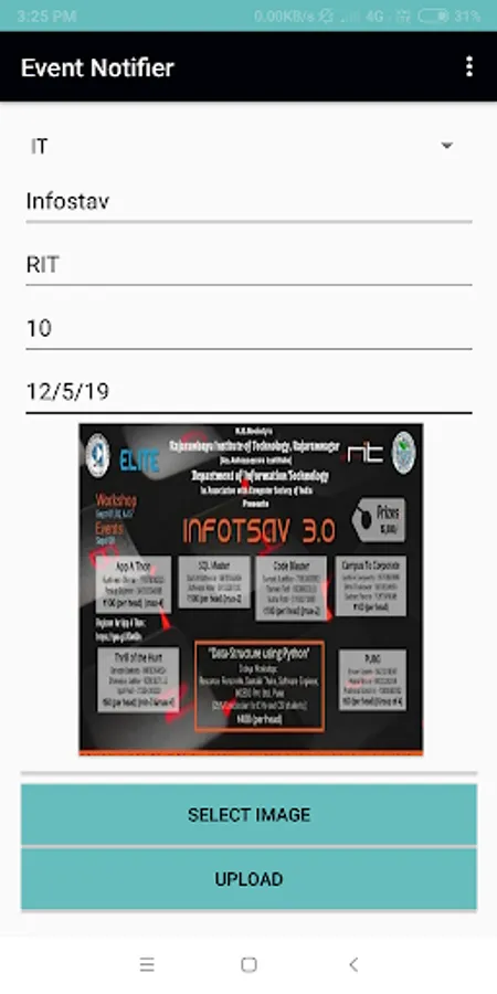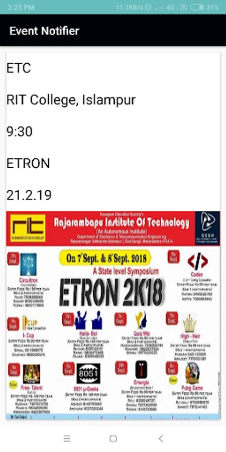 Event Notifier is an event notification app. This application provides information regarding various events organized by the department of RIT College.