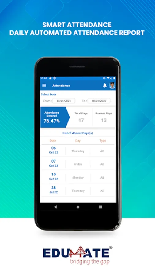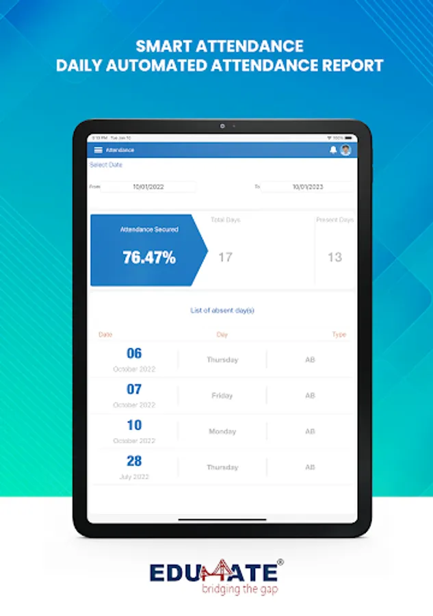 - For staff, the attendance reports are generated based on various criteria along with attendance percentages drilled down to student level.