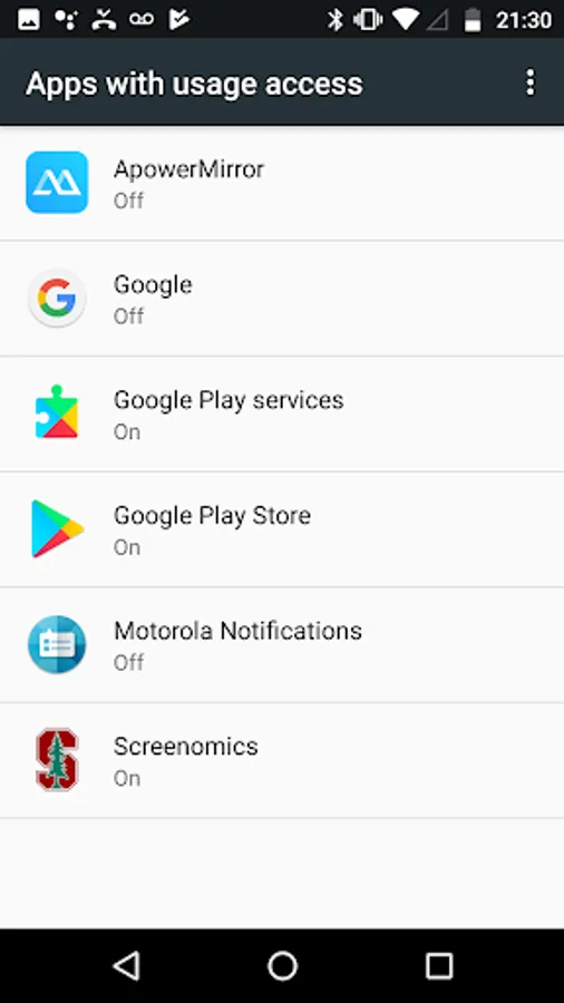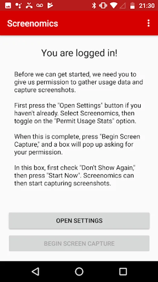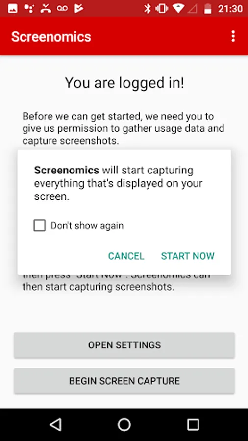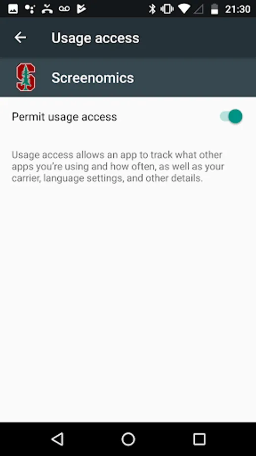 This app is being used by the Screenomics Lab at Stanford University and by academic affiliates for academic research. The app uses Media Projection API to capture screenshots and upload them to a server. Screenshots are captured upon screen unlock and at 5-second intervals. They are uploaded while connected to wifi, and deleted thereafter.