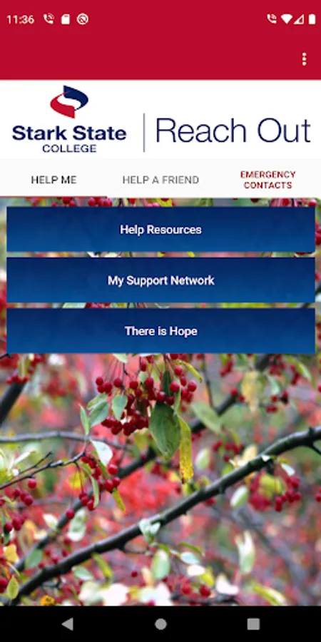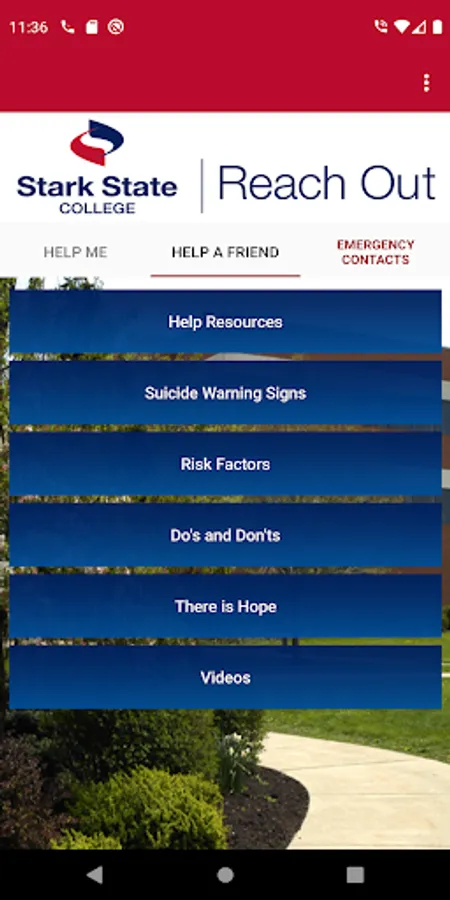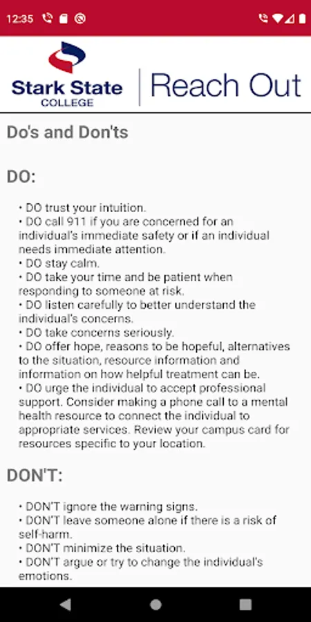 Stark State's Reach Out app provides quick access to guidance for supporting a friend in need, suicide prevention, or coping with mental health challenges. It also supplies information about resources, referrals, and counseling services offered on the campus and in the community, including crisis hotline numbers. The Reach Out app is designed for students, parents, friends of students, faculty, and staff of Stark State College, located in North Canton, Stark County, Ohio. The Reach Out app better prepares people to help a friend, loved one or themselves.