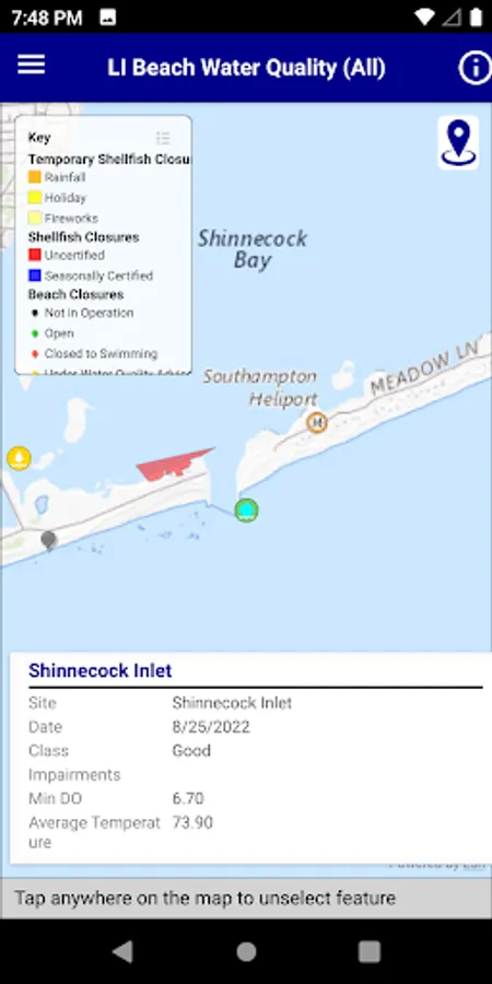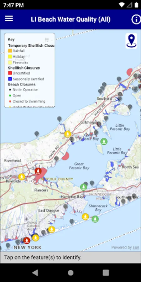 This is a mobile mapping application presenting up-to-date beach, shellfishing, and water quality of Long Island by integrating information from: 1) the water quality index data collected by SoMAS Gobler Lab at Stony Brook University, 2) beach closures from the New York State Department of Health, and 3) shellfish closures from the New York State Department of Environmental Conservation.