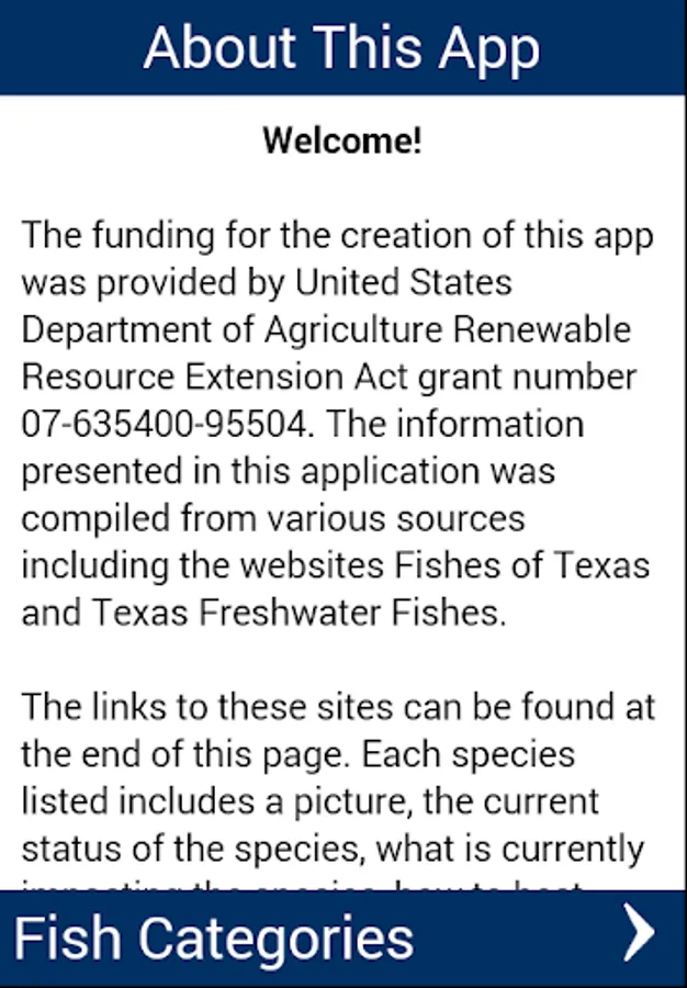This app is a comprehensive guide to threatened and endangered fish species endemic to Texas. This app provides photographs as well as taxonomic identification keys for these threatened and endangered fish species. Distribution maps are provided for each species so that the user may determine if their location is within the home range of any of these species. Habitat and general conservation information for each species is provided.