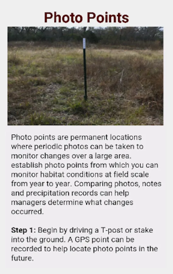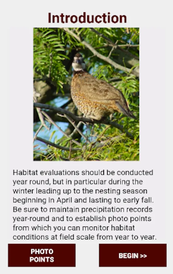 Habitat loss is a major factor in northern bobwhite declines over the last few decades. Although the plant species included are specific to central and west Texas, The Northern Bobwhite Habitat Evaluation app offers valuable habitat evaluation techniques for other regions as well. This tool allows the user to quickly and easily assess the habitat condition on the user’s property by posing a series of questions to be answered while in the field. The app calculates a habitat quality score based on the user’s input and provides recommendations for improving habitat beneficial for northern bobwhite.