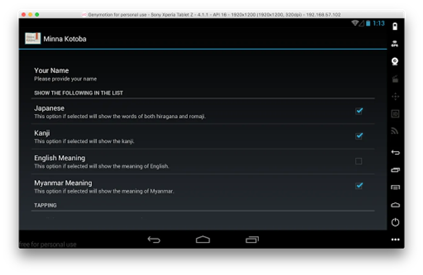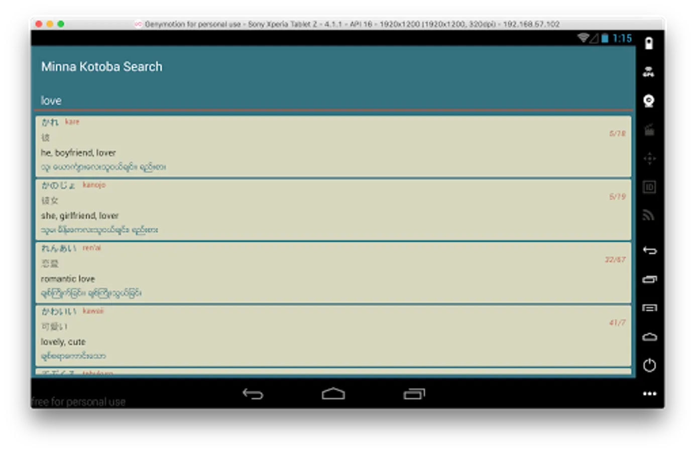 - Japanese pronunciation (using Android TextToSpeech Setting> Language & Input> Text-to-speech output> Google TTS voice data> Japanese downloaded putting Minna Kotoba, just click on the vocabulary and pronunciation)