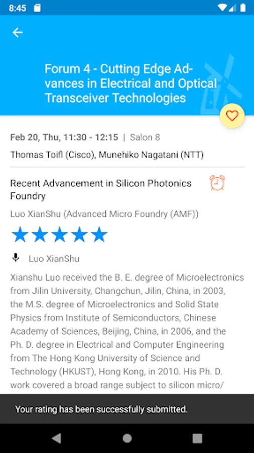 As a unique highlight, the app allows you to rate any of the demos in both demo sessions. Your rating will be used for selecting the best demo in the conference program.
