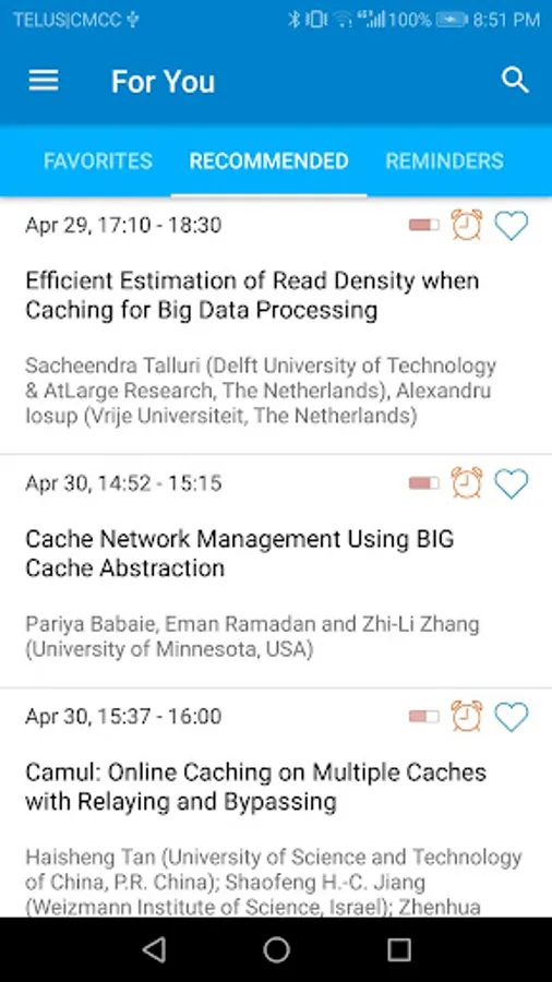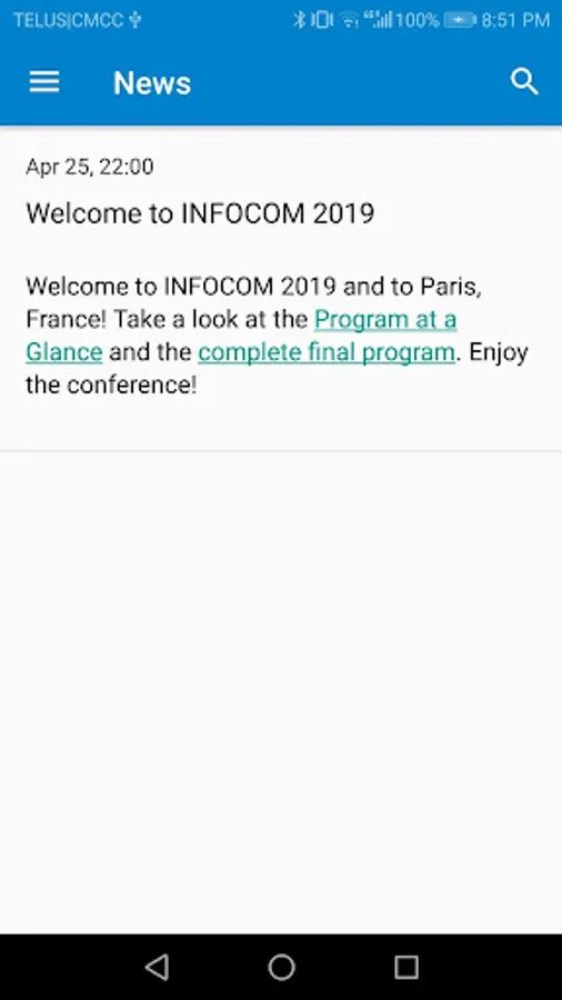 The app supports the ability to add favorites, search through the program for session titles, talk titles, author names, and rooms, and download any of the papers in the INFOCOM 2019 main program. A "Recommended For You" feature automatically recommends similar talks based on your favorites in the main conference program. The app works entirely offline.