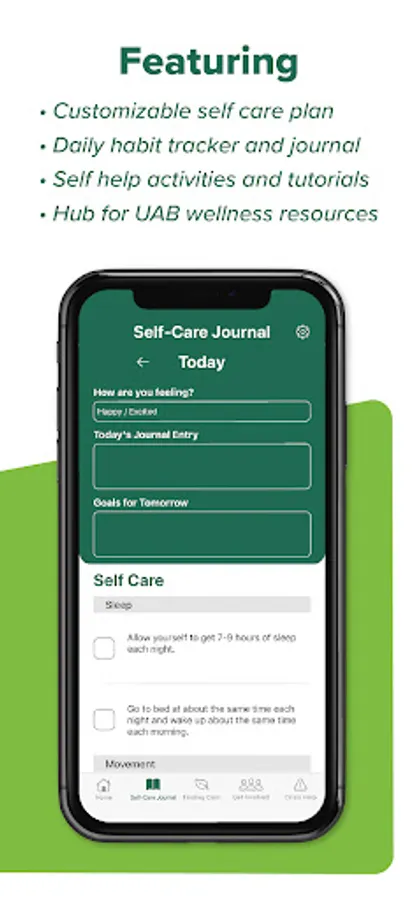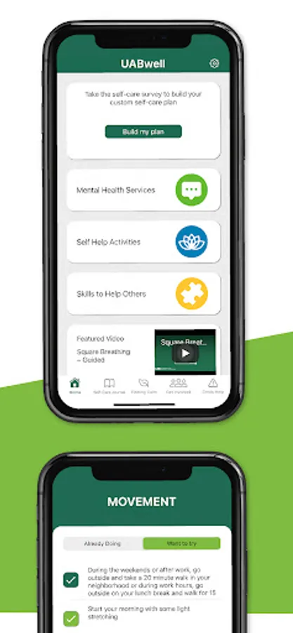 Students at the University of Alabama at Birmingham can use the UABwell app to create a personalized self-care plan that builds good habits in sleep, movement, nutrition routine and resiliency. The habit checklist and wellness journal — visible only to you — help you meet your goals and track your journey to better self-care and mental health. In addition, self-help tools in the app put mental health services, mindfulness resources, and campus mental health and recreation events at your fingertips. Crisis help is also available. Build your plan today to help reach your mental health and wellness goals.