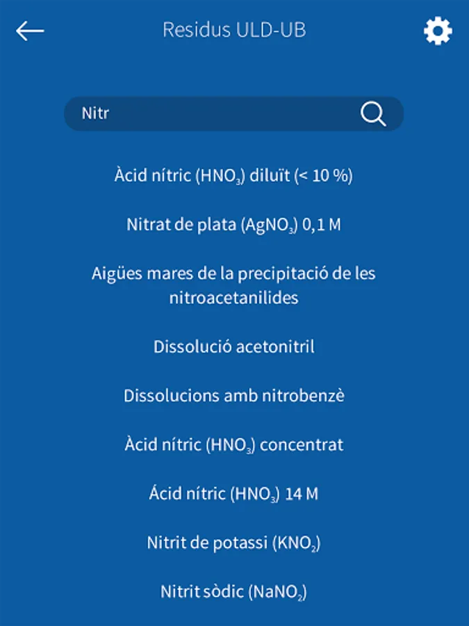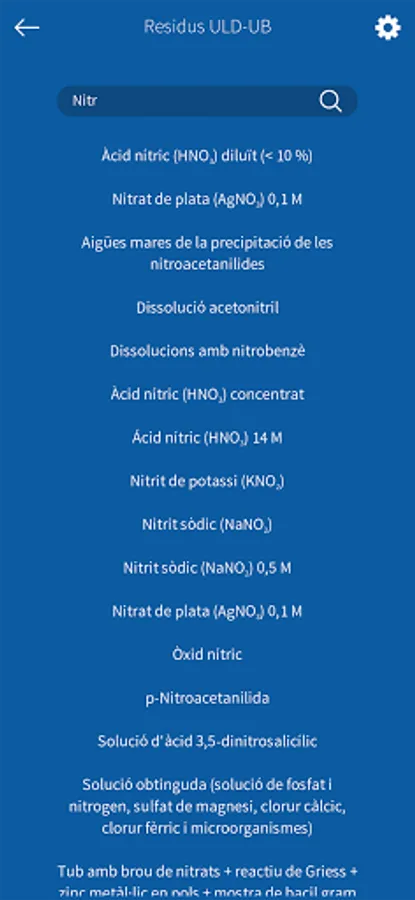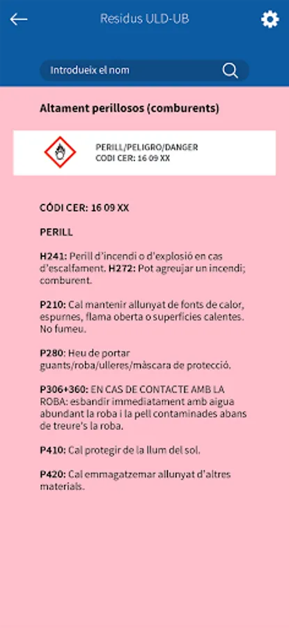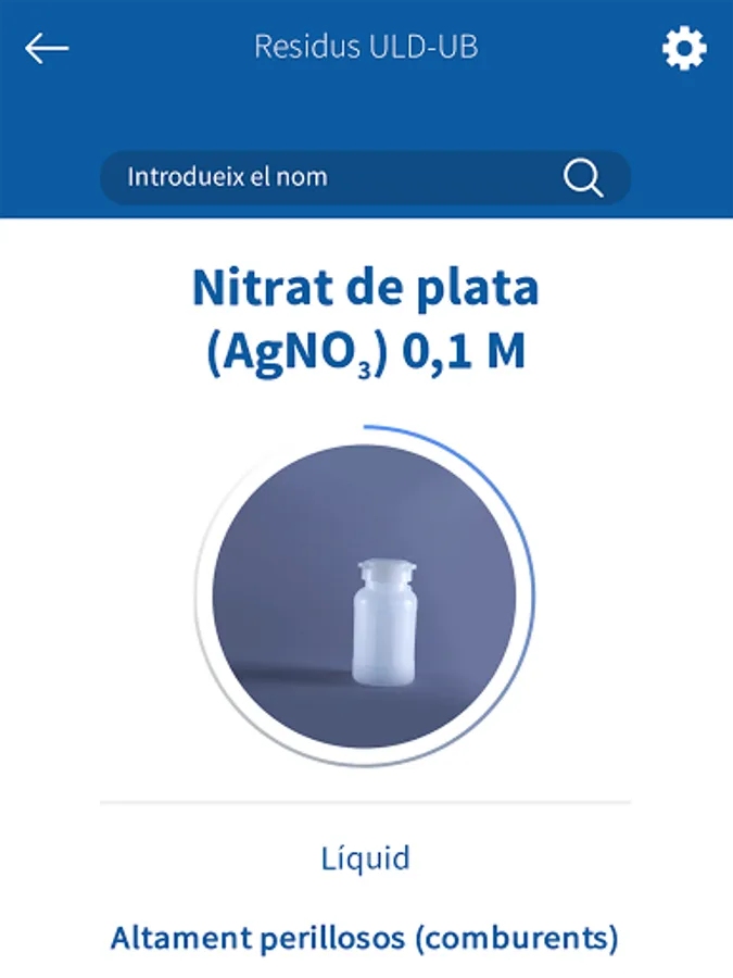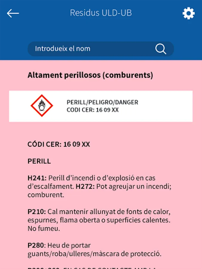 This application allows users to search for the correct container to dump the waste generated in the practical classes of the degree of Pharmacy of the Faculty of Pharmacy and Food Sciences of the University of Barcelona (UB). In addition, it provides information on the products to be removed: pictograms and H and P phrases (indications of danger and precautionary advice). Residus ULD-UB has been prepared by the Teaching Laboratories Unit (ULD-UB) in collaboration with the Office of Safety, Health and the Environment and the Audiovisual Service of the UB. This application is part of the mobility project of the University of Barcelona.