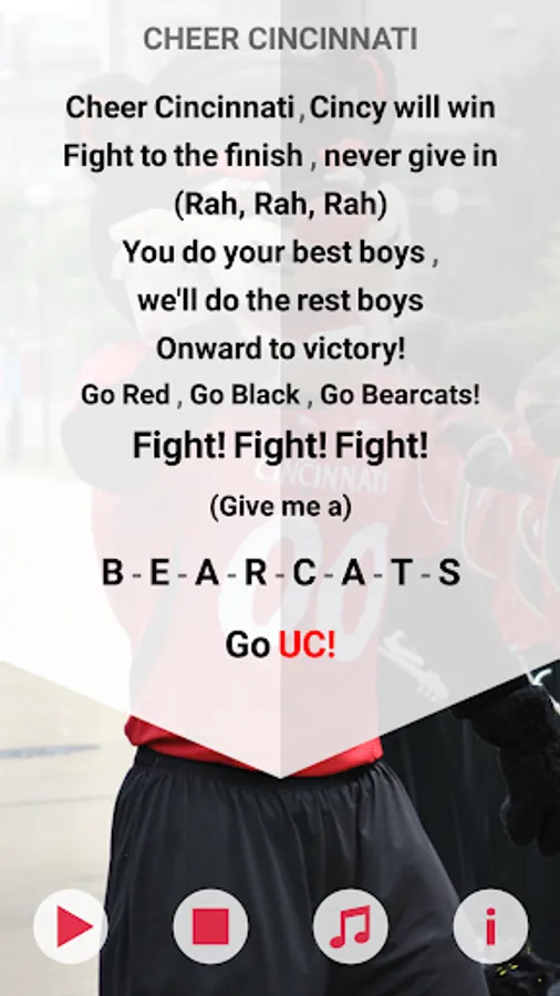 Play and sing along the fight song (Cheer Cincinnati) to help cheer the bearcats to victory. Show your support and shake your smartphone to make the Bearcats GROWL!!!