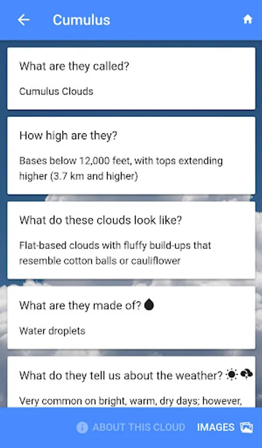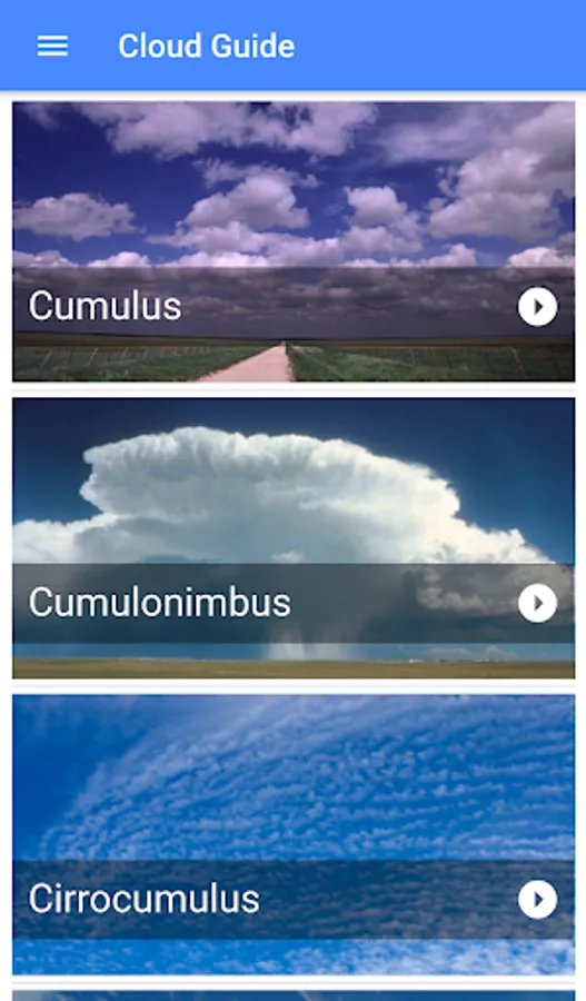 The UCAR Center for Science Education's Field Guide to Clouds is a portable guidebook to identifying clouds. Learn about the different clouds in the sky, including how they form, how they get their names, and what they can tell you about the weather. Test your cloud knowledge with quizzes and share photos of interesting clouds you find on social media.