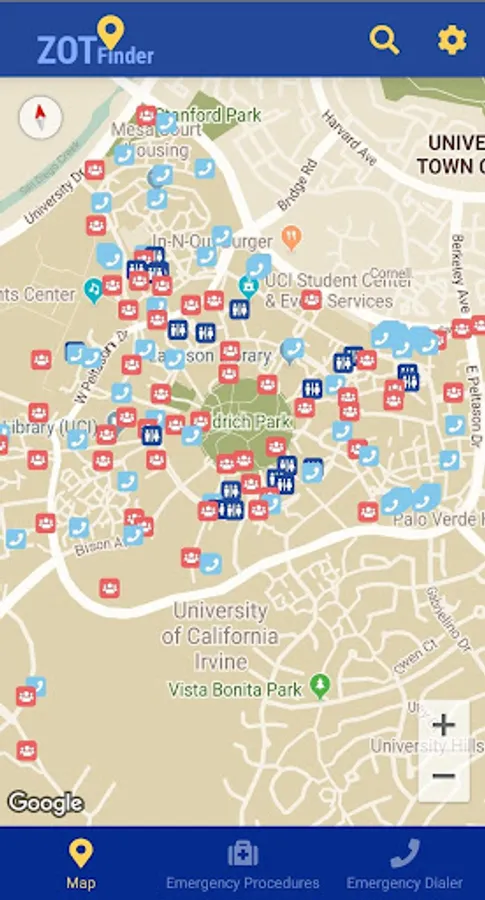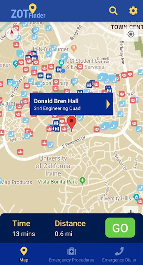 ZOTFinder is a mobile application specifically designed for the UCI campus and focuses on two important issues. First, ZOTFinder allows you to search for faculty, buildings, departments or services on campus whose location can then be displayed on a map for easy identification. A routing feature then provides you with the shortest path to your destination. Second, you can use ZOTFinder to quickly access a digitized version of the UCI emergency red flip chart, allowing you to always be prepared in case of an emergency while also providing important emergency support numbers. ZOTFinder: everything you need to know about UCI, at your fingertips.