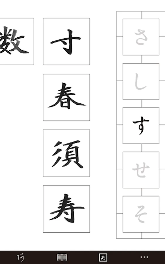 Basically, it's a sort of Matrix-style riff on a stack of flashcards. The app presents you with a kana. If you nudge it a bit with your finger, it will flip over and turn into the kanji from which the kana was derived. You will also see the modern kana that tells you how to read the kanji. You can throw a kana out of the stack or toss it back in so it will keep appearing. Then, once you have learned it, you throw it out, too.