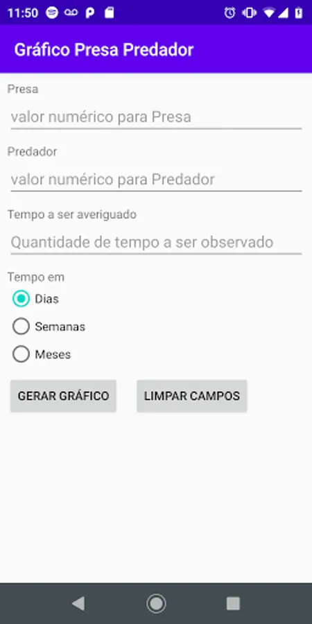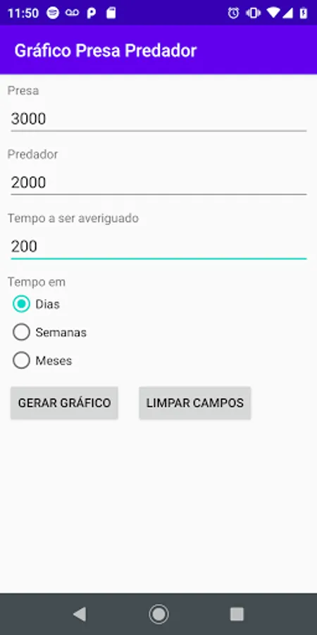 Obtain graphics generated from computer simulation of the prey-parasitoid relationship between fruit flies and their natural predator, based on the mathematical model developed by Noronha (2017). From the insertion of the amount of prey and predator, together with the time to be observed, the corresponding graph is generated.