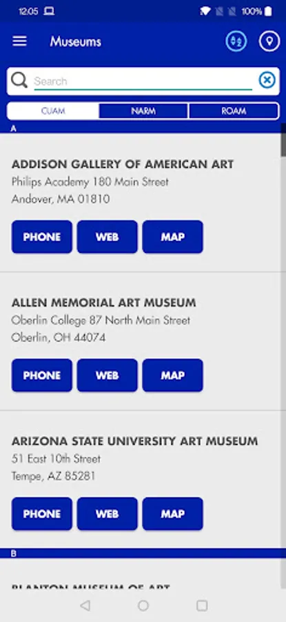 3. Museums List – The Museum List includes all the museums that belong to the NARM, ROAM, and CUAM networks. The list is searchable by name, city, state, and zip code. The museums’ addresses are listed along with their main phone numbers and websites. The map feature enables the user’s phone to locate a selected museum in relation to his/her GPS location.