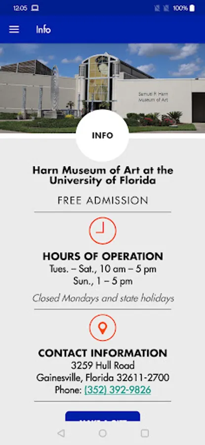 1. Information Page – The Information Page is specific to the Harn Museum of Art and lists the Harn’s address, phone number, and hours. The bottom of the Information Page includes the Harn’s donation button and links to Harn social media.