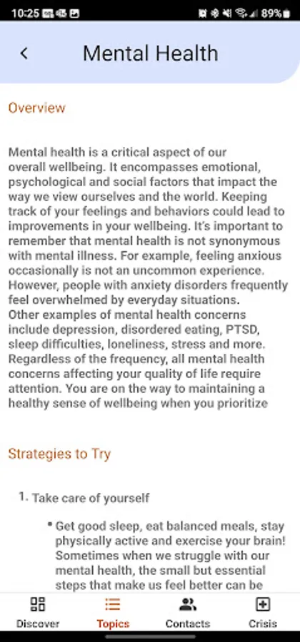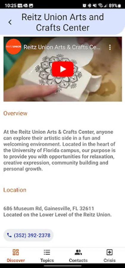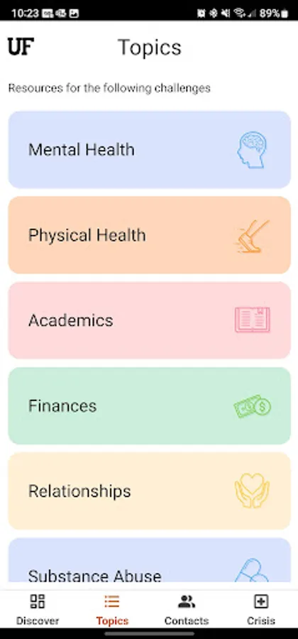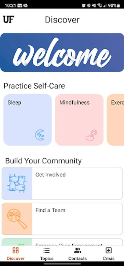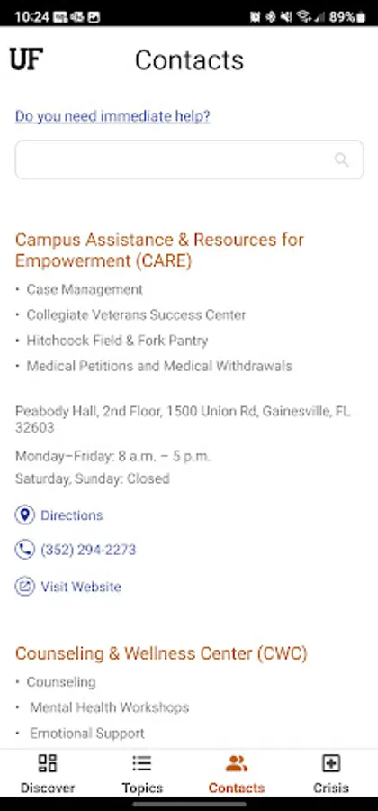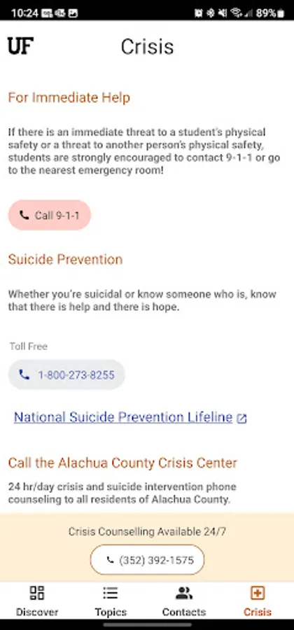 The Contacts and Crisis tabs provide straightforward suggestions for connecting you with the right resource. You can schedule an appointment with UF Counseling and Wellness Center and more from the app.