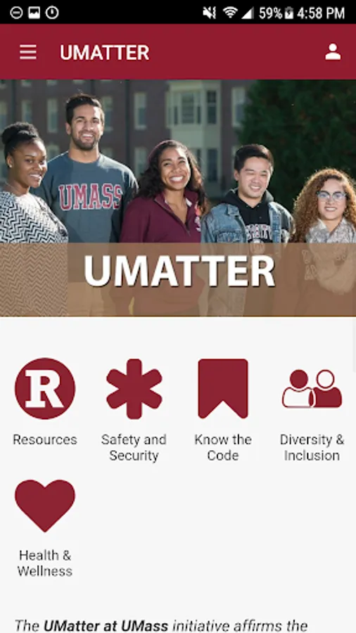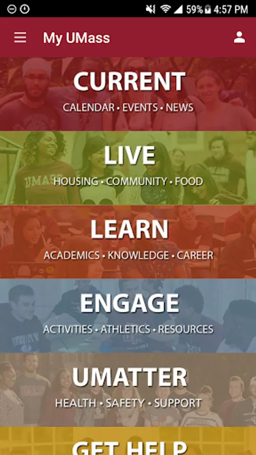 My UMass, formerly Living at UMass, provides the University of Massachusetts Amherst community mobile access to campus events, calendars and notifications. Important information and deadlines from a variety of programs and resources are available at your fingertips. Enjoy student experience videos and social media feeds for a virtual look into student life at UMass. Explore ways to connect with your community, engage with your peers, build relationships, succeed academically, and utilize the many resources available to you at UMass.