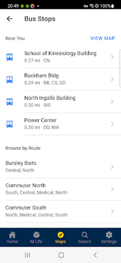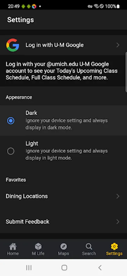 The Michigan App provides in-app messages and reminders related to academic life, personalized class schedule information, search based on places (campus buildings) and people (faculty, staff and students), location-based content including bus stops, parking locations and dining halls, and featured university events.