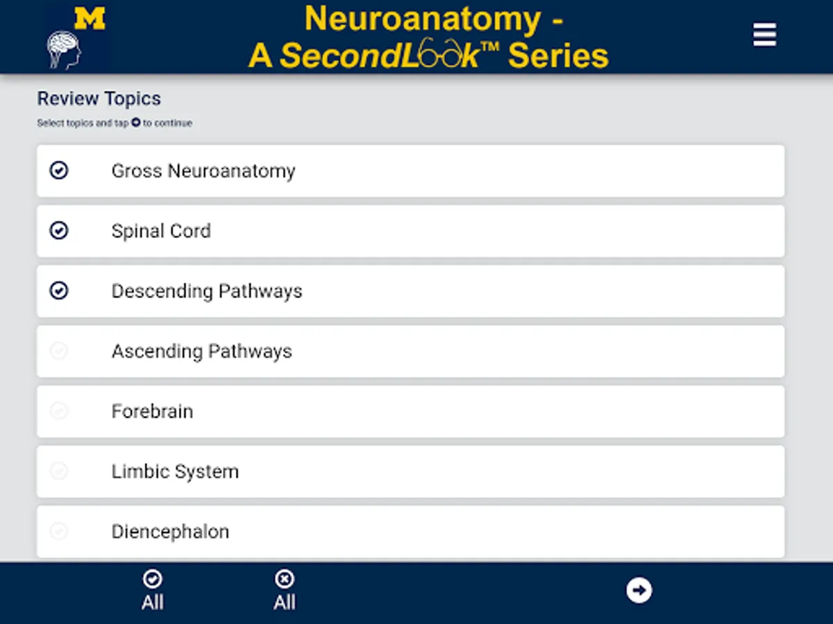 The Neuroanatomy SecondLook™ application is a study aid that provides a series of neuroanatomical images for users to self-test their level of knowledge and ability to recognize structures within the human central nervous system. This application was developed with the learner in mind, especially medical, dental, nursing, and other health sciences students, and lab professionals. The complete app has twelve slide sets, covering Gross Neuroanatomy, the Spinal Cord, Ascending and Descending Pathways, Cranial Nerves, the Diencephalon, Forebrain, Brain Stem, the Limbic System, the Auditory/Vestibular System, Visual System, and Neurohistology. It follows the award-winning concept of the other SecondLook™ mobile apps. By taking a "SecondLook" at these images, users are able to quickly self-evaluate and test their knowledge about the human central nervous system in order to identify gaps and to be better prepared for tests. This mobile application will also serve as an excellent review tool to prepare for licensing examinations.