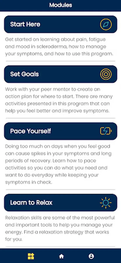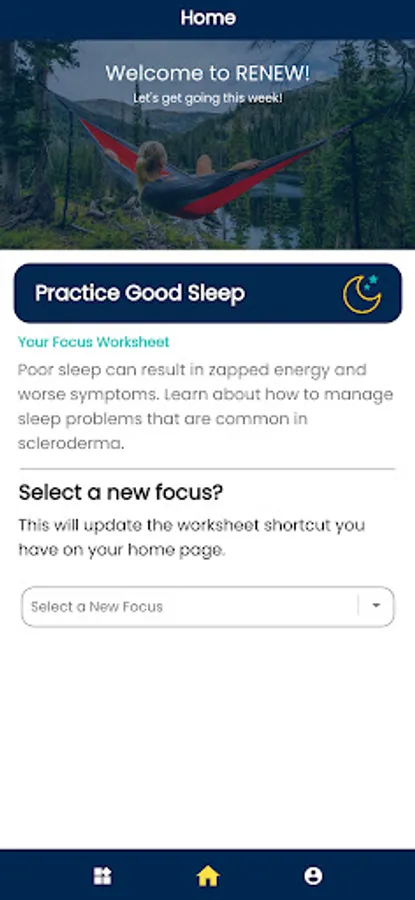 Renew Scleroderma helps people with scleroderma manage their fatigue and enhance wellbeing. It involves health coaching from trained peer mentors. Renew Scleroderma allows users to read information about scleroderma and to set and track weekly goals and complete activities relevant to these goals.