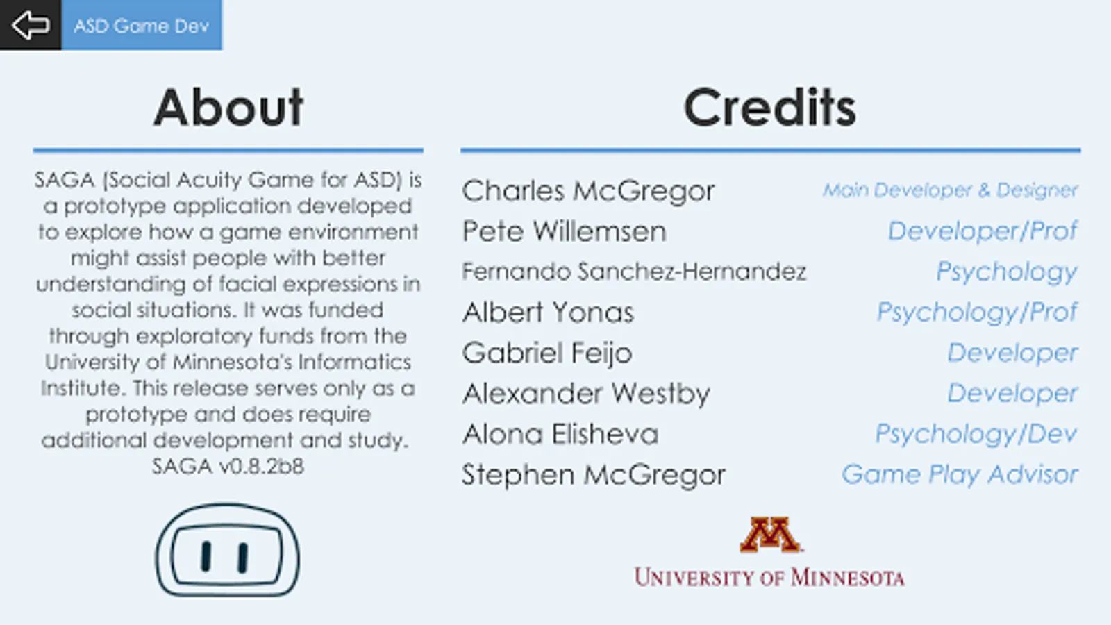 SAGA (Social Acuity Game for ASD) is a prototype application developed to explore how a game environment might assist people with better understanding of facial expressions in social situations. It was funded through exploratory funds from the University of Minnesota's Informatics Institute. This release serves only as a prototype and does require additional development and study.