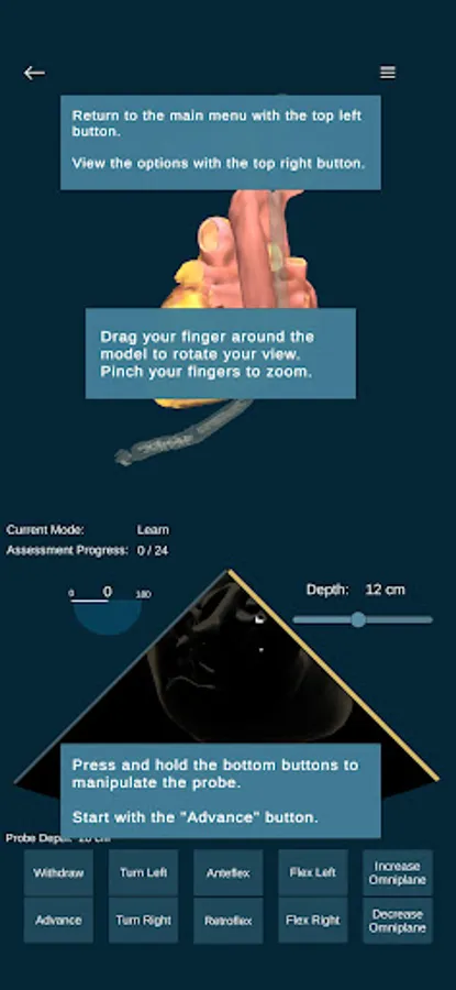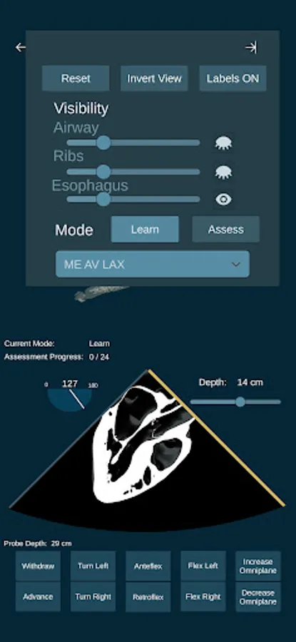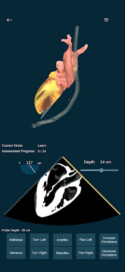 The University of Minnesota TEE mobile app allows physicians, students, and the general public to access a real, animated human heart for training transesophageal echocardiography. This simulator allows students to understand the controls of a TEE probe along with the ability to see how the two-dimensional image of an echo screen is mapped to the three dimensional heart. This simulator can be used to train for TEE certifications and improve the general abilities of all TEE users by training whenever and wherever they want for free.