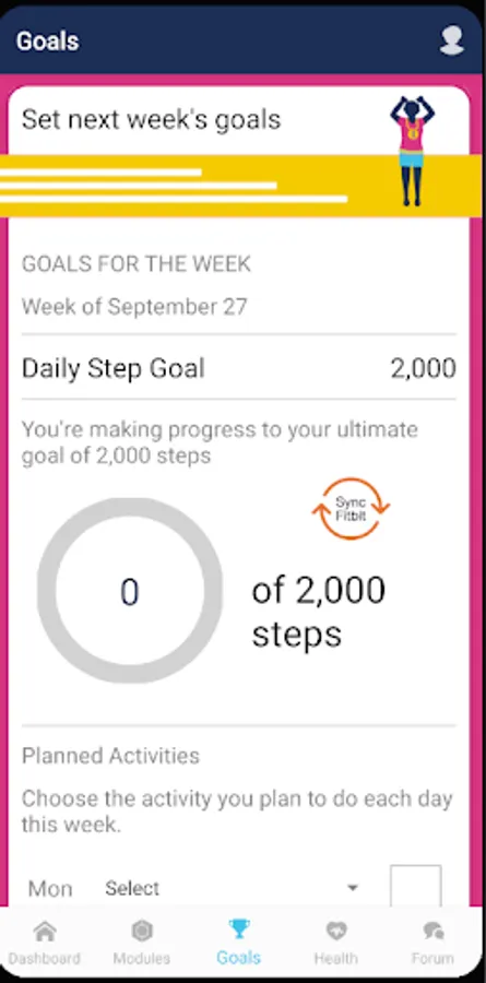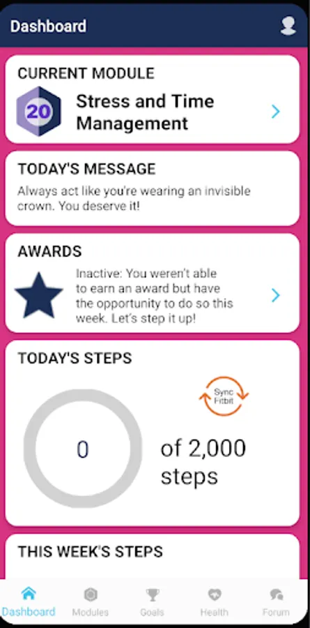 Step it Up is a general wellness app designed to encourage low cost, community centered, physical activity. The program focuses on exercise, healthy eating, and behavior change with personalized feedback tools that support cardiovascular health. Local geofences specific to the user will trigger text location opportunities for exercise. Step it Up includes educational modules and a social support forum. Participants will connect their Fitbit device, Aria II scale, Omron blood pressure device and the option for logging daily blood glucose.