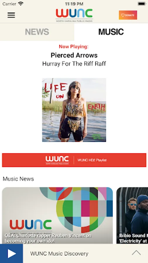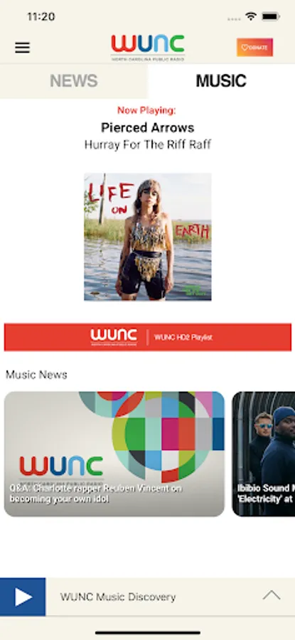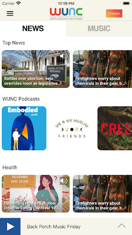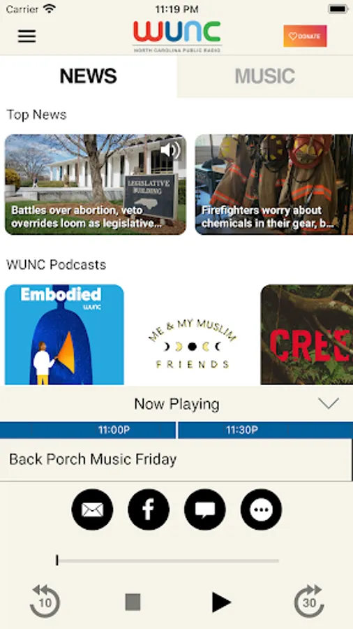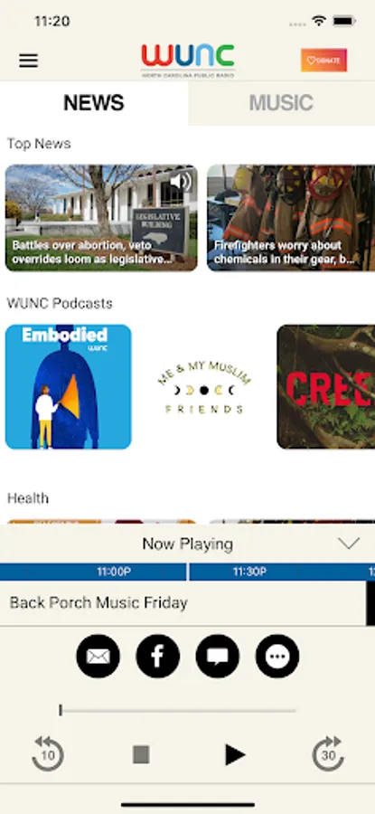 • Listen to live streams from WUNC even while traveling! Start the app and your favorite station starts playing.