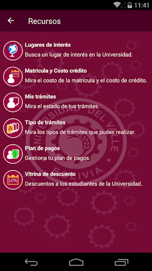 The information available through the application is related to: main data subjects, schedules, information on classrooms, payment plan, consultation books, weather, attractions, contacts, events, news, showcase discounts and many more ...