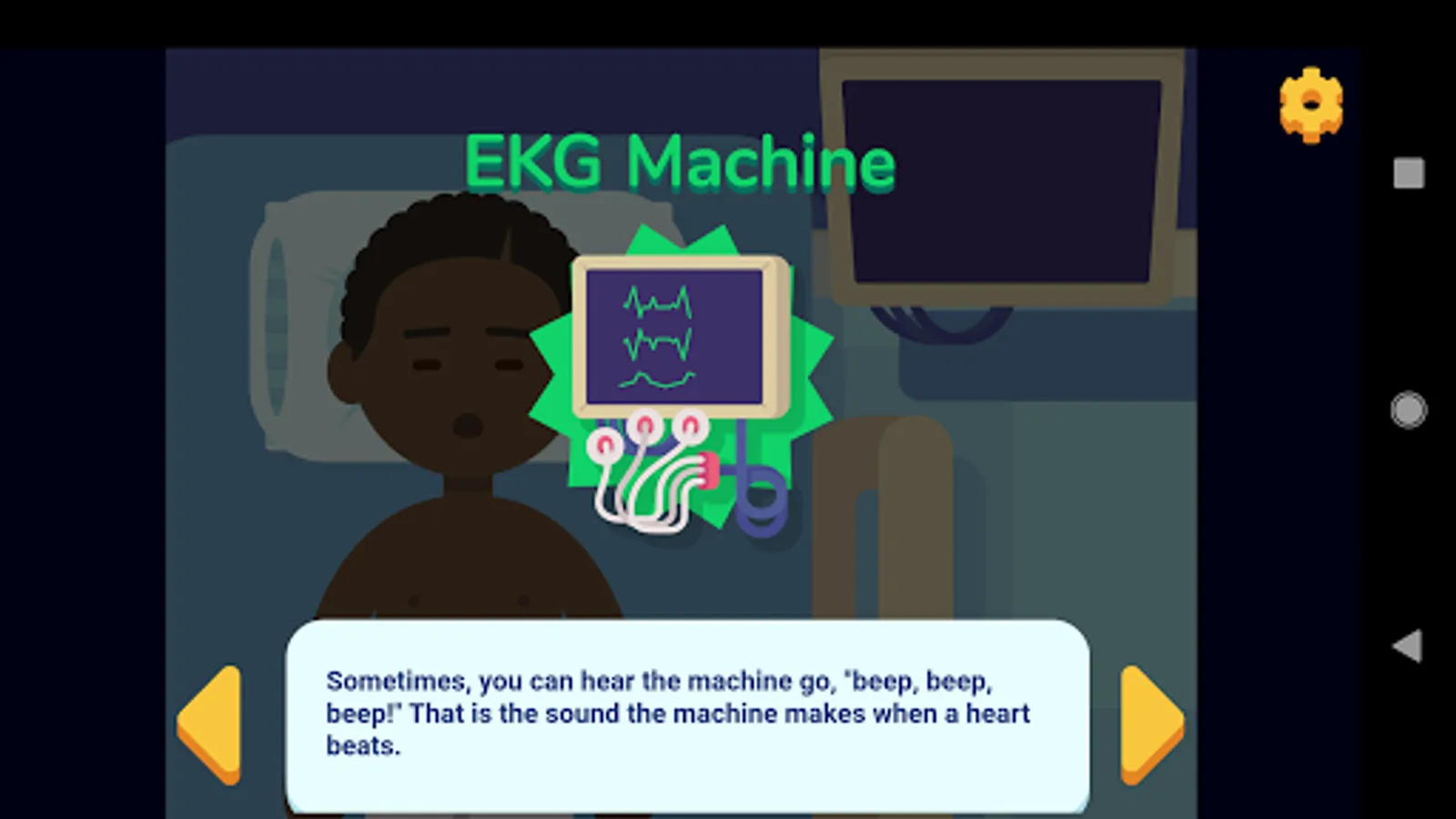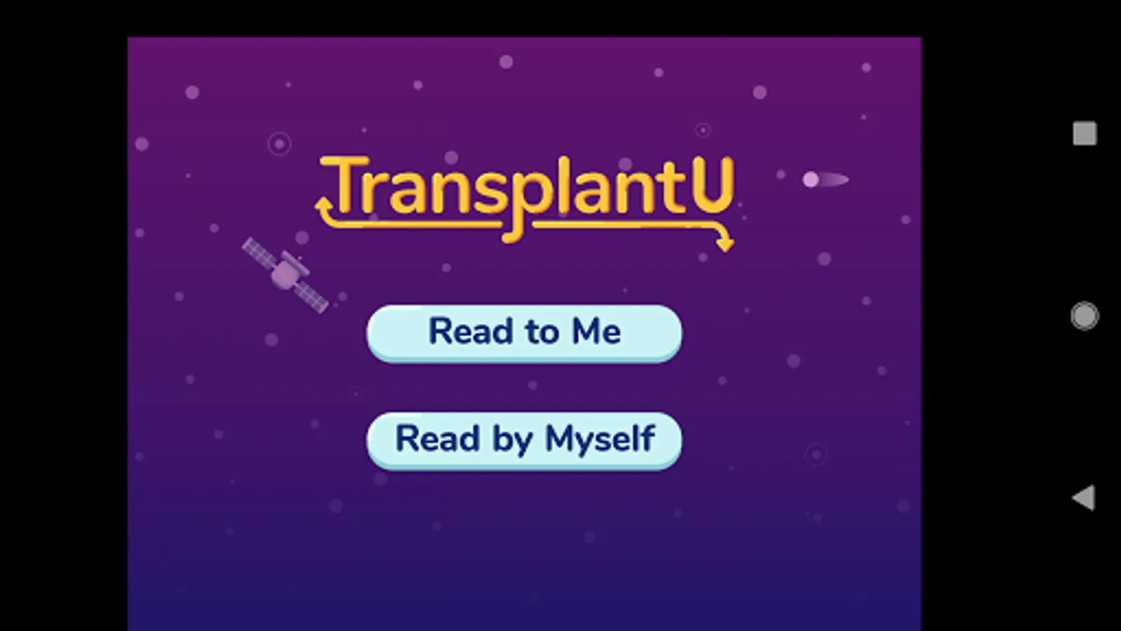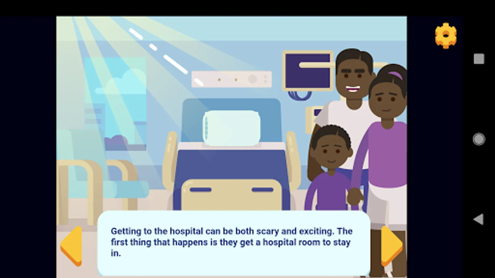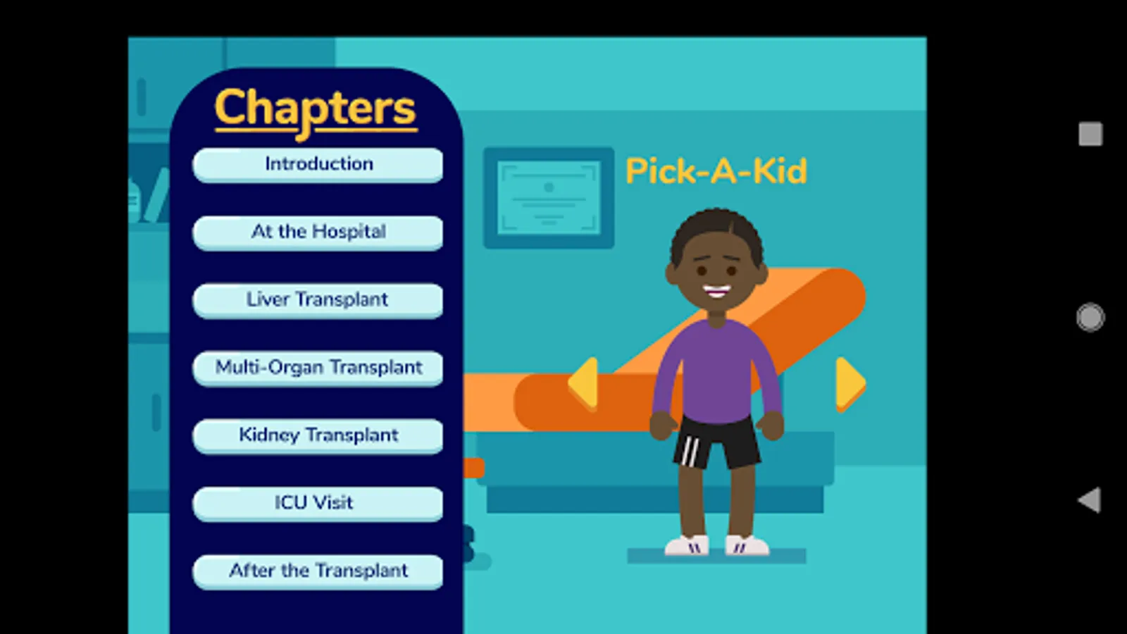 A child-friendly solid organ preparation tool with captivating graphics, explanations, and suggestions for coping. Users experience the transplant process through an interactive introduction of what to expect upon arrival and after the transplant. App features include self-paced learning with "read to me" or "read by myself" options, multicultural avatar selections, and drag and drop engagement with transplant-related medical equipment.