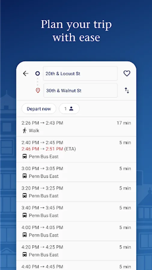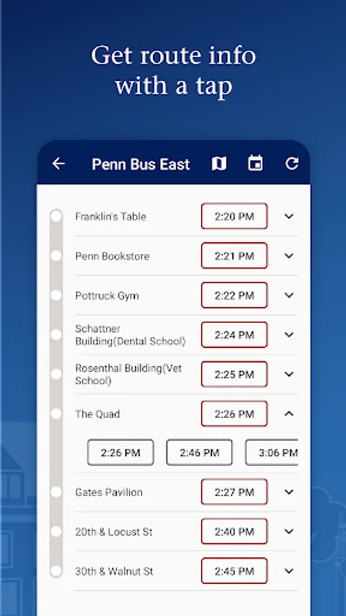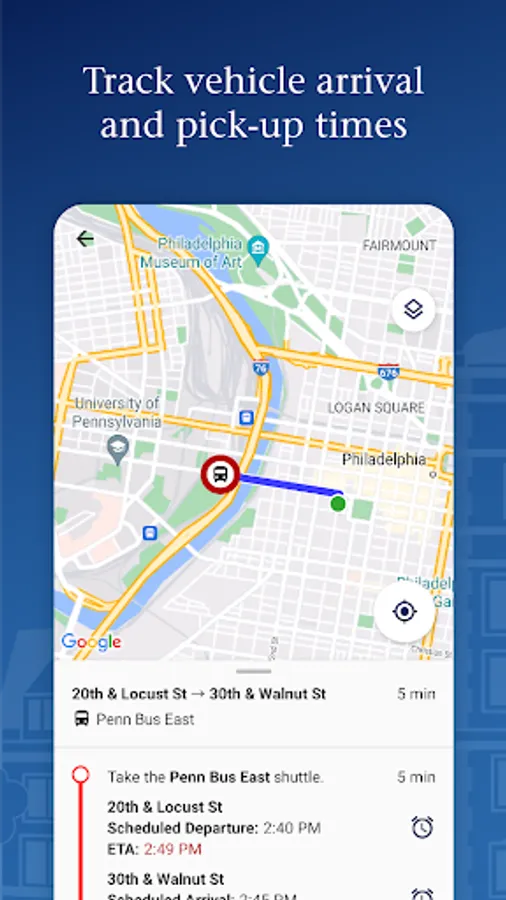 PennTransit Mobile helps you travel to, from, and around campus and the surrounding neighborhoods easily. See all of your options in one place: Penn Bus East and West, On-Demand Shuttles, and specialty services like the Pennovation Works Shuttle and Penn Accessible Transit. This app provides you accurate vehicle locations and arrival times, ensuring you have the information you need when you need it so you can arrive safely and on time. Simply download the app, login securely with your PennKey, and you're ready to go!